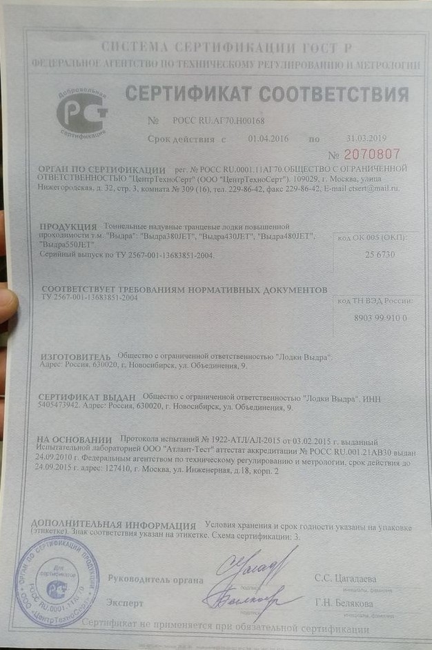 я сейчас получаю НОВЫЙ сертификат, куда вписаны новые модели лодок Выдра650jet, Выдра430Аян, Выдра500Чульман и Выдра600Алдан