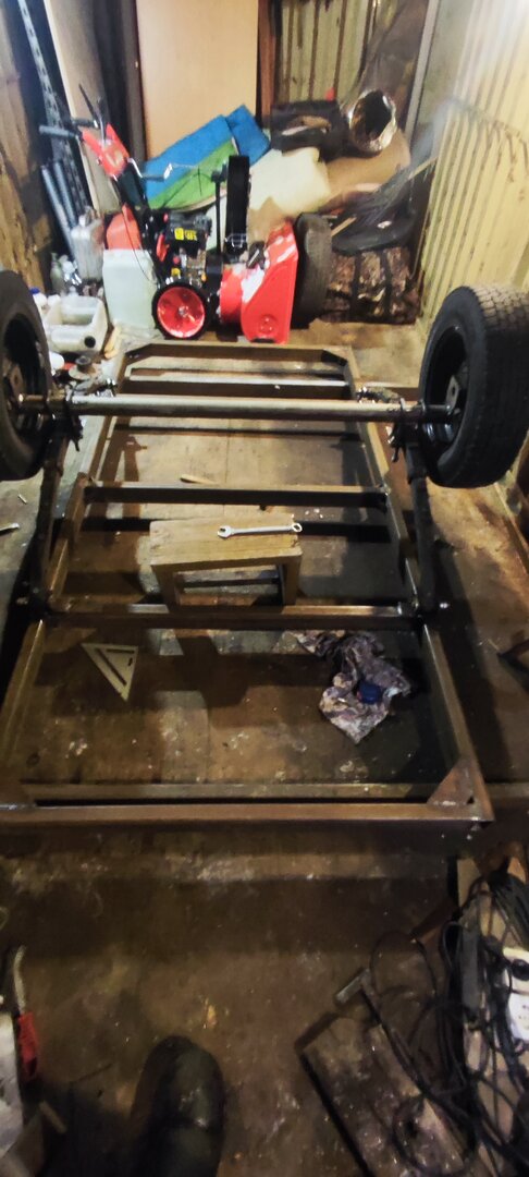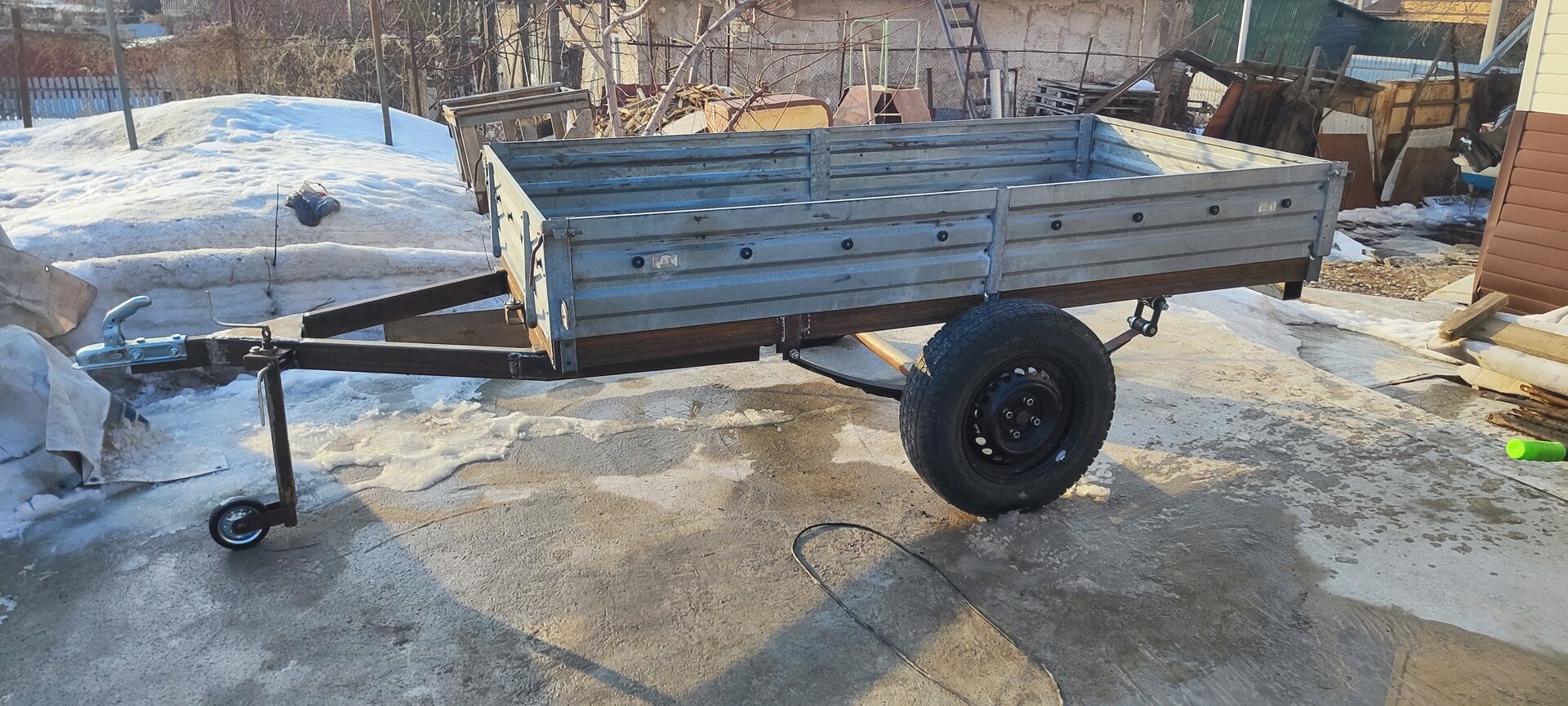 В Омске заказал раму самосвального прицепа с доками. Пришла собрали усилили раму косынками. Рессоры в 3 листа . Колеса поставил на 15. В круг обошелся в 60 тысяч наших рублей. Без проблем поставил на учет. Буран Лидер с корытом и с вещами спокойно умещаются в нем.