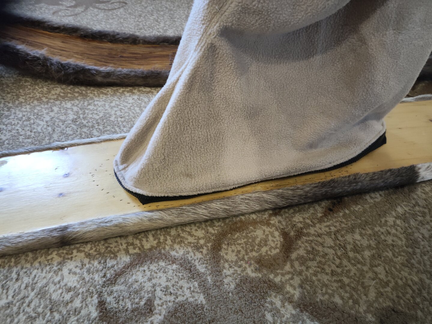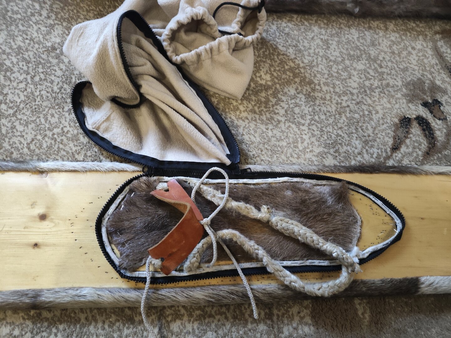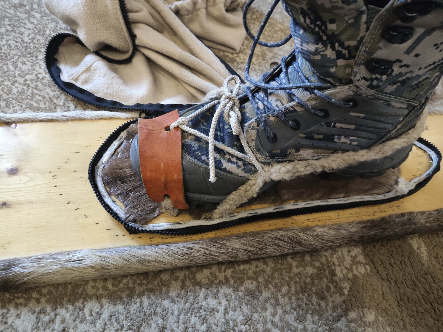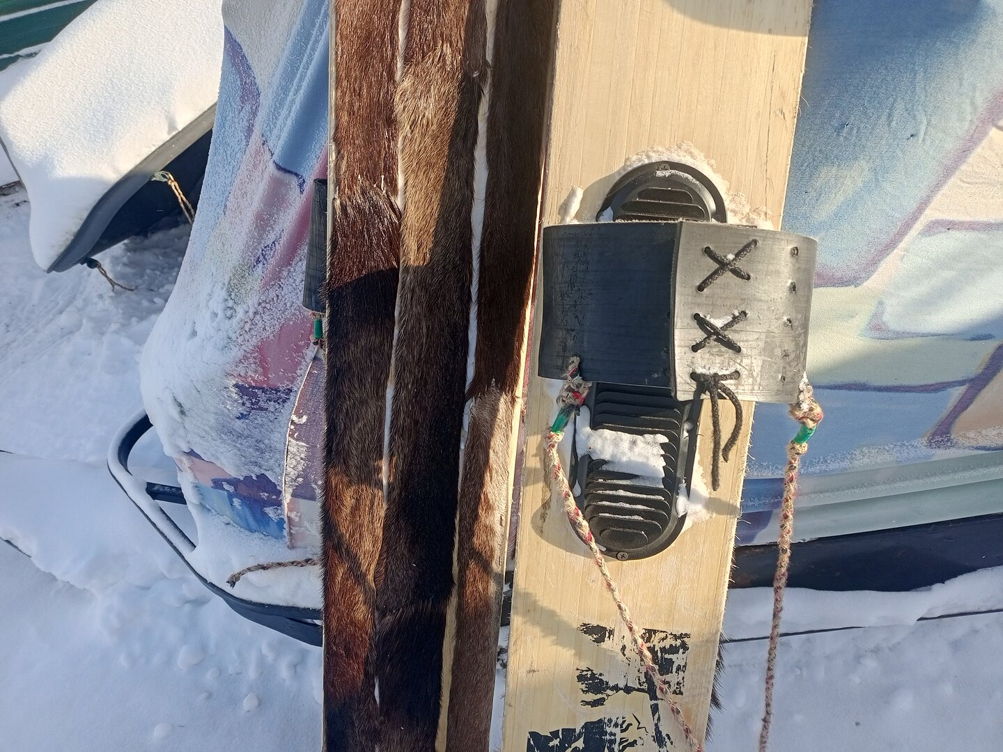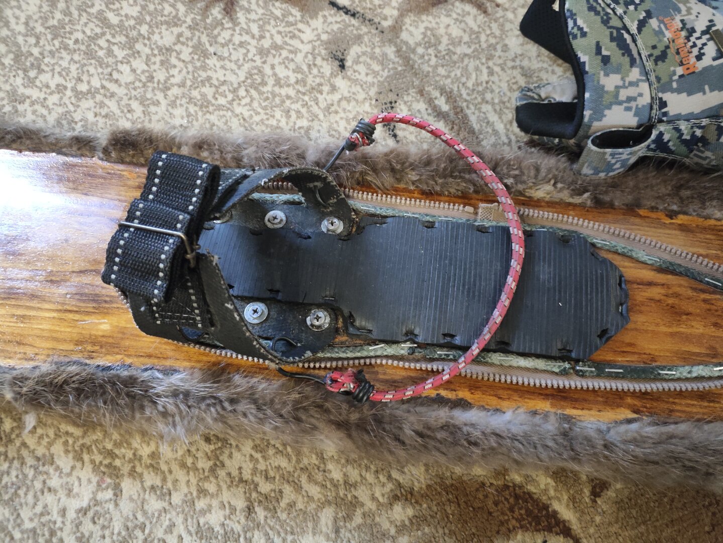 Пользую два вида креплений. Одно по типу эвенкийского, которое с веревками. Второе из ленты транспортной. Оба удобные, оба нравятся при ходьбе. Но из транспортной ленты лучше управляемость лыжи. Особенно когда нужно лыжу поднять и боком перелезть через преграду. Крутишь стопой, лыжа повторяет движение, а на эвенкийских она более болтается на стопе.