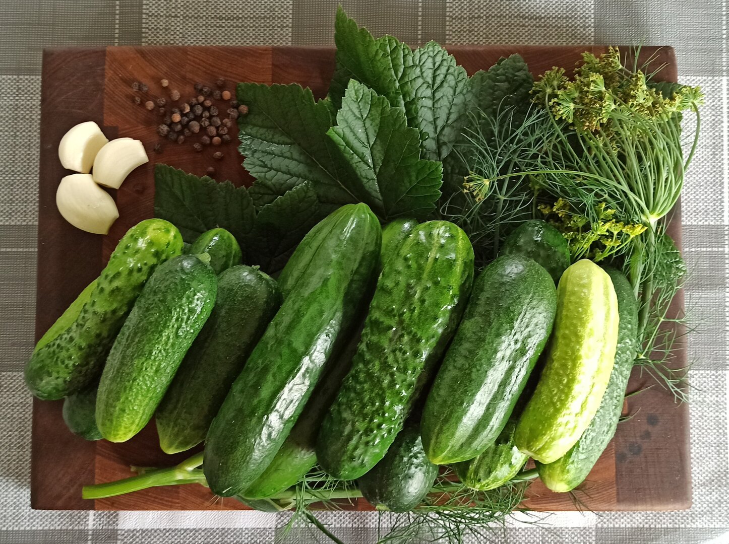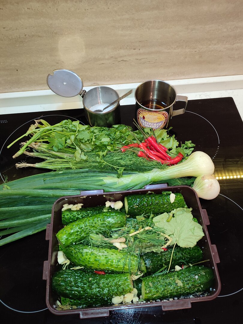 Посмотреть вложение 350803 Я делаю по такому рецепту: на 600г огурцов кидаю 1/2 столовая ложка соли, 1/2 чайная ложка сахара, 3-4 зубчика чеснока, перец чёрный горошком примерно 20-30шт, пару листов смородины и укроп.