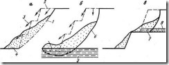 б) оползни выпирания образуются при наличии в основании откоса борта карьера слабых пластичных глин или обводненных пород с невысокой прочностью. В этом случае под действием массы прибортового массива слабые породы основания частично выдавливаются в выработанное пространство карьера. Поверхность скольжения частично проходит через породы основания борта, а векторы, замеренные по реперам его основания, направлены вверх. В основании перед оползнем формируется вал выпирания, сложенный породами дна карьера (рис. 2.4, б);
