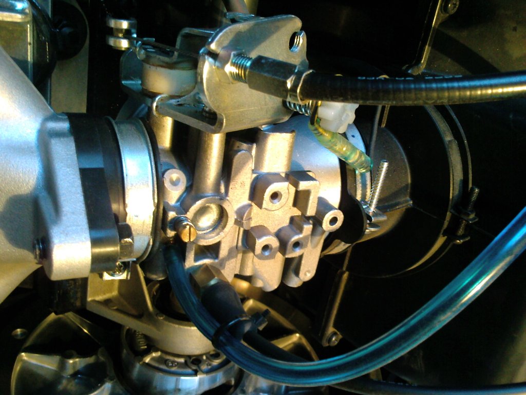 Тройничек вставлен в разрыв шланга, который подходит к карбу. На фото он чуть выше пластмассового винта