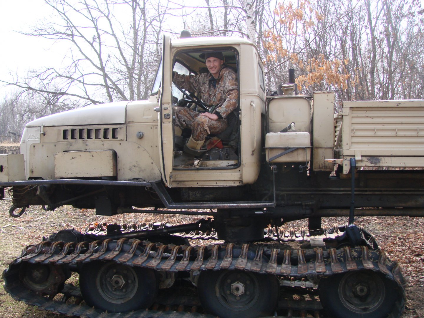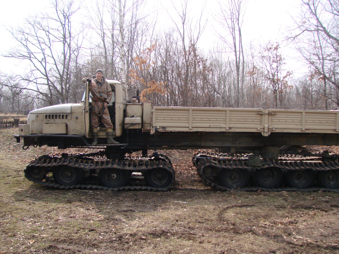 Это заводская машина.Гусеничный снегоболотоходный транспортёр "УРАЛ"5920". Название само за себя говорит ,где его применять.Грузоподъёмность 8 тонн.Лес особо не повозишь.