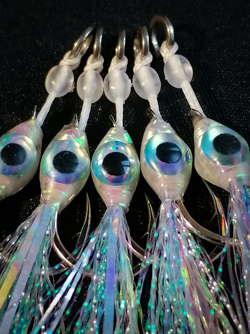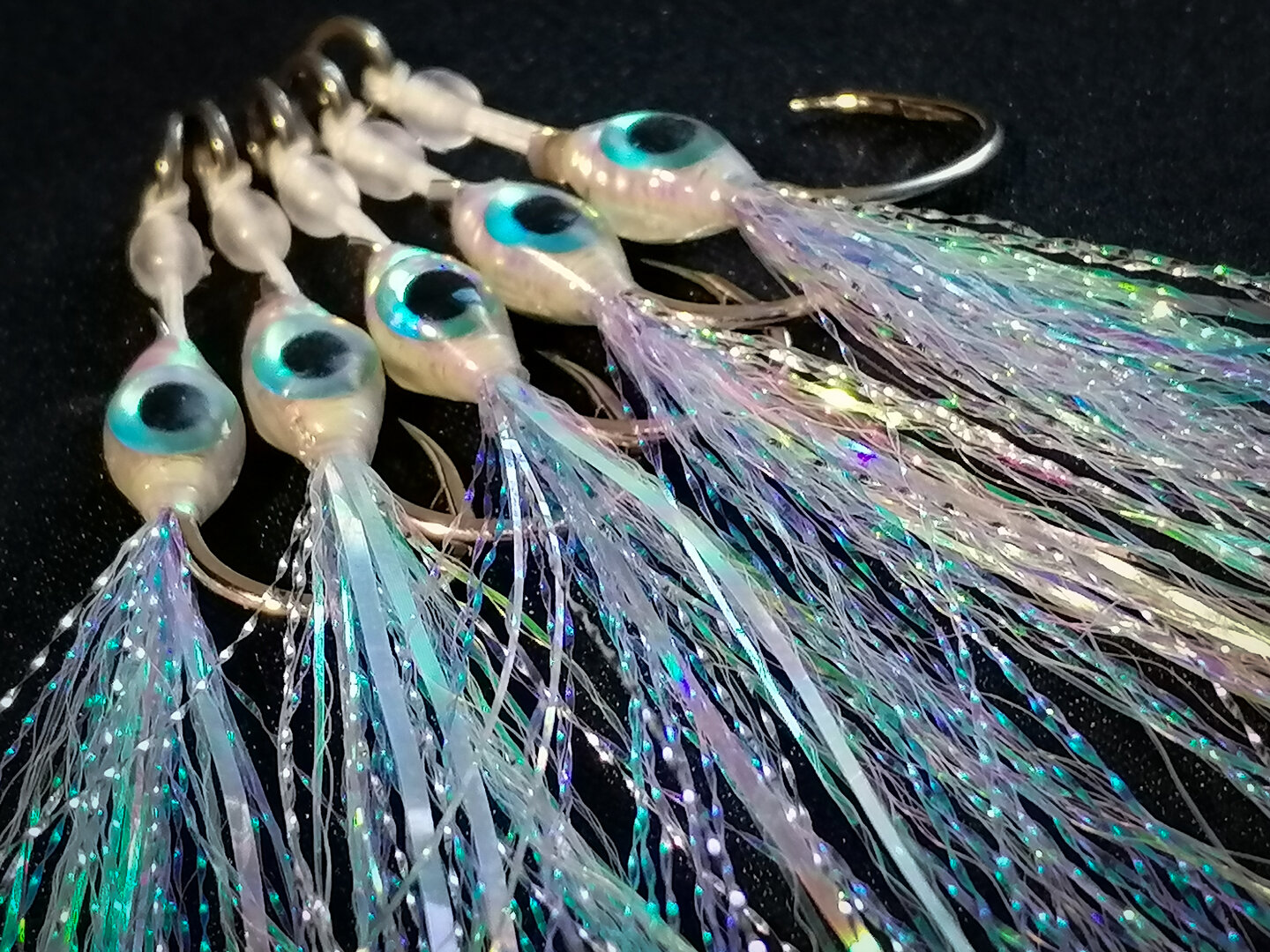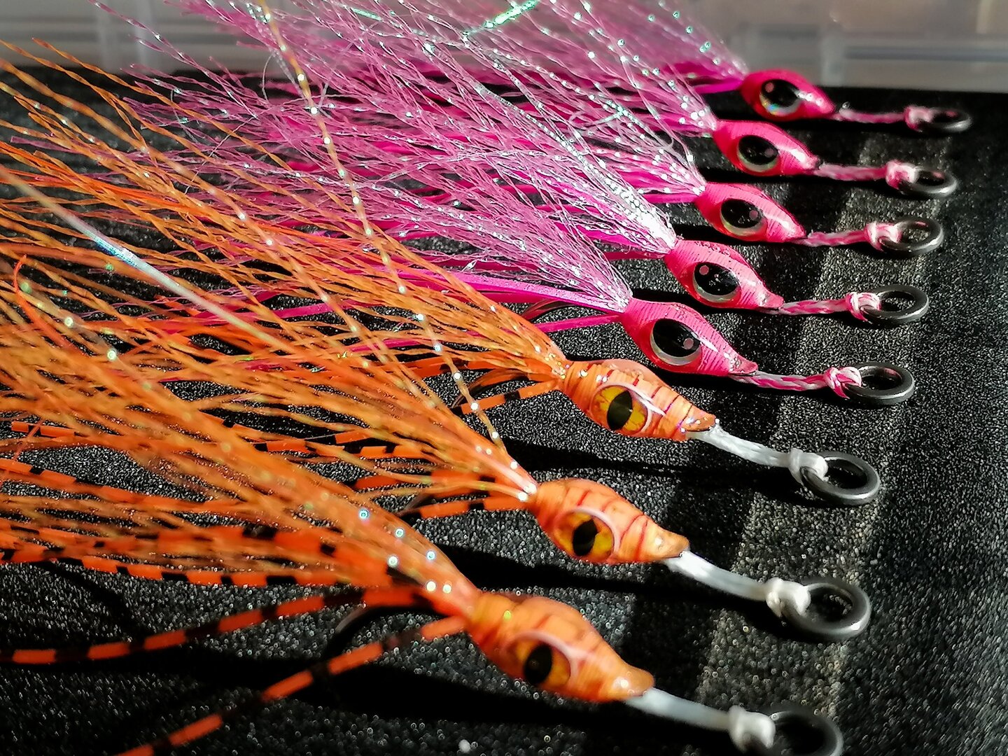 Со временем я определил для себя 5-6 самых рабочих цветов для ассистов, которые работают как на море, так и на пресных водоемах - розовый, натуральный под малька (перламутр или более синий), шартрез, оранжевый, светонакопительный (для морских ночных рыбалок).