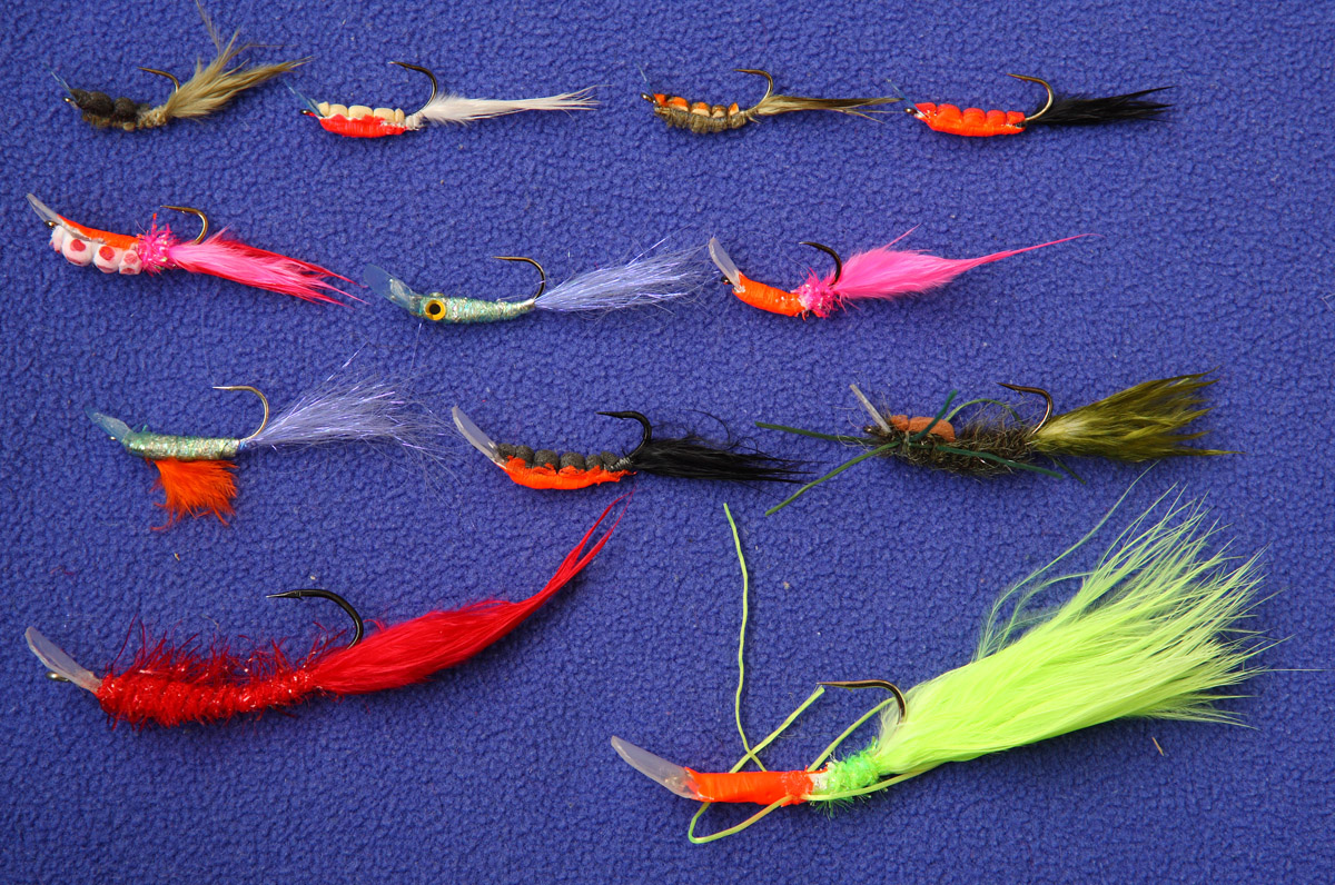 По поводу муховоблеров: лопатки из шприца я делать перестал, слишком хрупкие. Я их делаю в 3 слоя (не склеиваю) из обычных пластиковых бутылок. Самым крупным нужно 4 слоя, а маленьким достаточно 2. На крючок надеваю три треугольника разных размеров (первый самый большой), обматываю крючок ниткой с хорошим клеем, приматываю узкие части треугольников, выравниваю и даю высохнуть сутки. Затем ножницами придаю лопасти форму, ставлю хвост (марабу или марабу плюс люрекс), наматываю тело (чаще из синели или даббинговых монтажей) и закрепляю спинку из пенки. Остаётся обкатать готовую приманку в ванне и подрезать, если уходит в сторону, лопасть с одной из сторон. Пока я описываю "классические" муховоблеры - это те, что идут крючком вниз. "Перевёртыши", которые при проводке идут крючком верх, огружены треугольником из свинцовой ленты плюс со стороны жала крючка иногда (не всегда ) ставится полоска пенки. Ещё есть т.н. Антивоблер - он движется лопастью вверх, но крючком вниз, при подтягивании всплывает. Вообще изготовление разных типов муховоблеров подробно описано (с картинками) в моей книжке 2007 года. На картинке - разнообразные Перевёртыши. Один (левый во 2 ряду сверху) по ошибке попал на фото - это классический муховоблер в перевёрнутом положении.