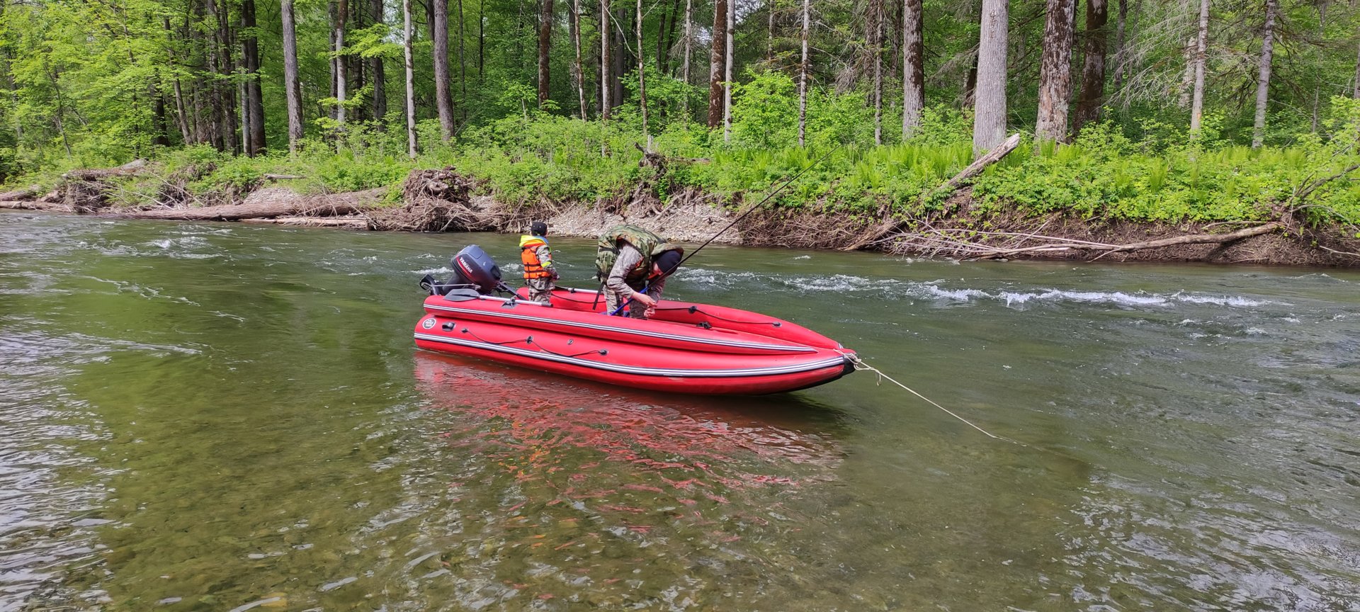 Похоже, высоту надставки для транца удалось угадать с первого раза (делал мастер!). Лодку вообще не переделывал (никаких пластин не устанавливал). В общем, получился удачный комплект эгоиста для катания по горной речке в одного-двух с удочками. Волна была небольшая, но даже на волнах от катеров воздух не хватает. Позже замерю грузоподъёмность на полном газу. Ну, и попробую ещё чуть поднять мотор.