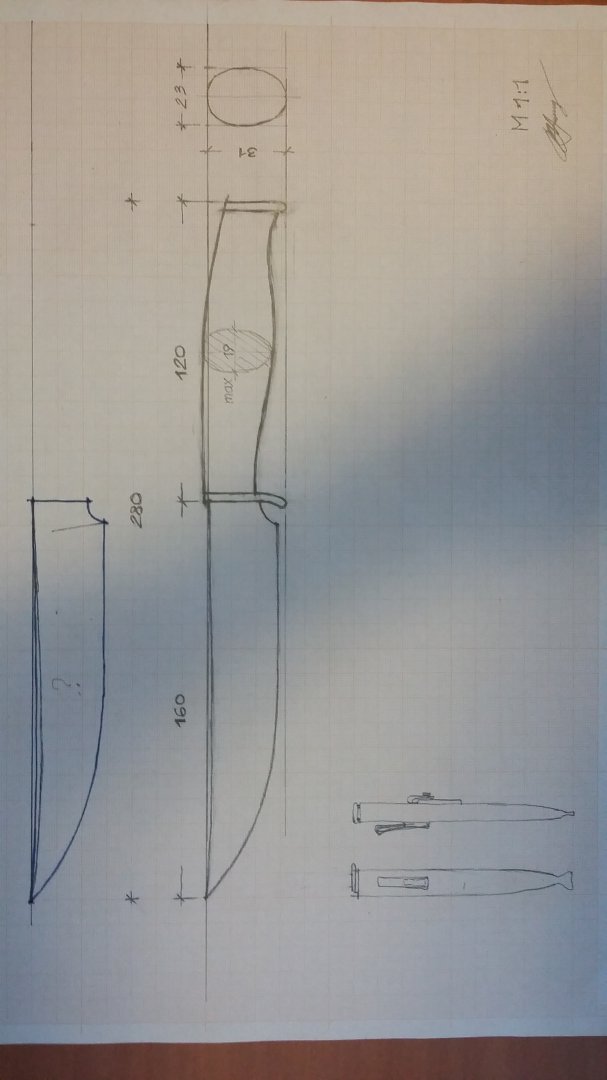 Добрый день, Дмитрий! Готов заказать разделочный нож, примерно как на эскизе. Сталь 95Х18, рукоятка - кап или др. дерево, бронза, ножны - полные - нат. кожа(носить на шее), карманчик для конс. ножа(плоский), заточка - под бритву, худ. рисунки на лезвии(с фото моего пса), готов обсуждать заказ при встрече.