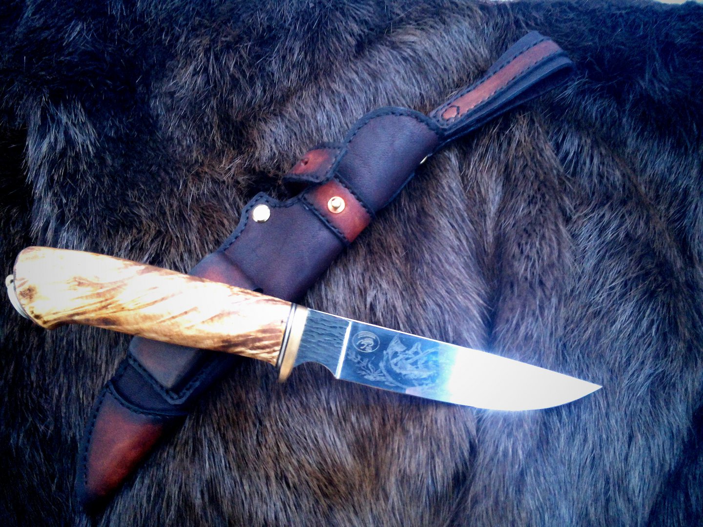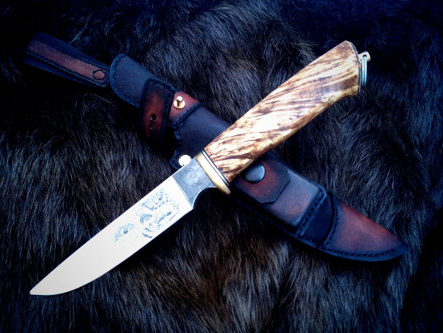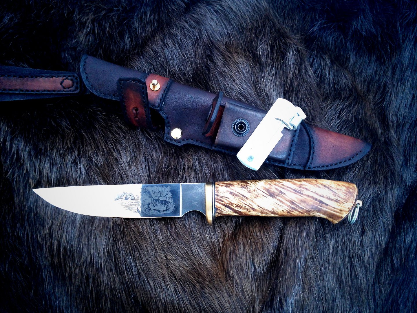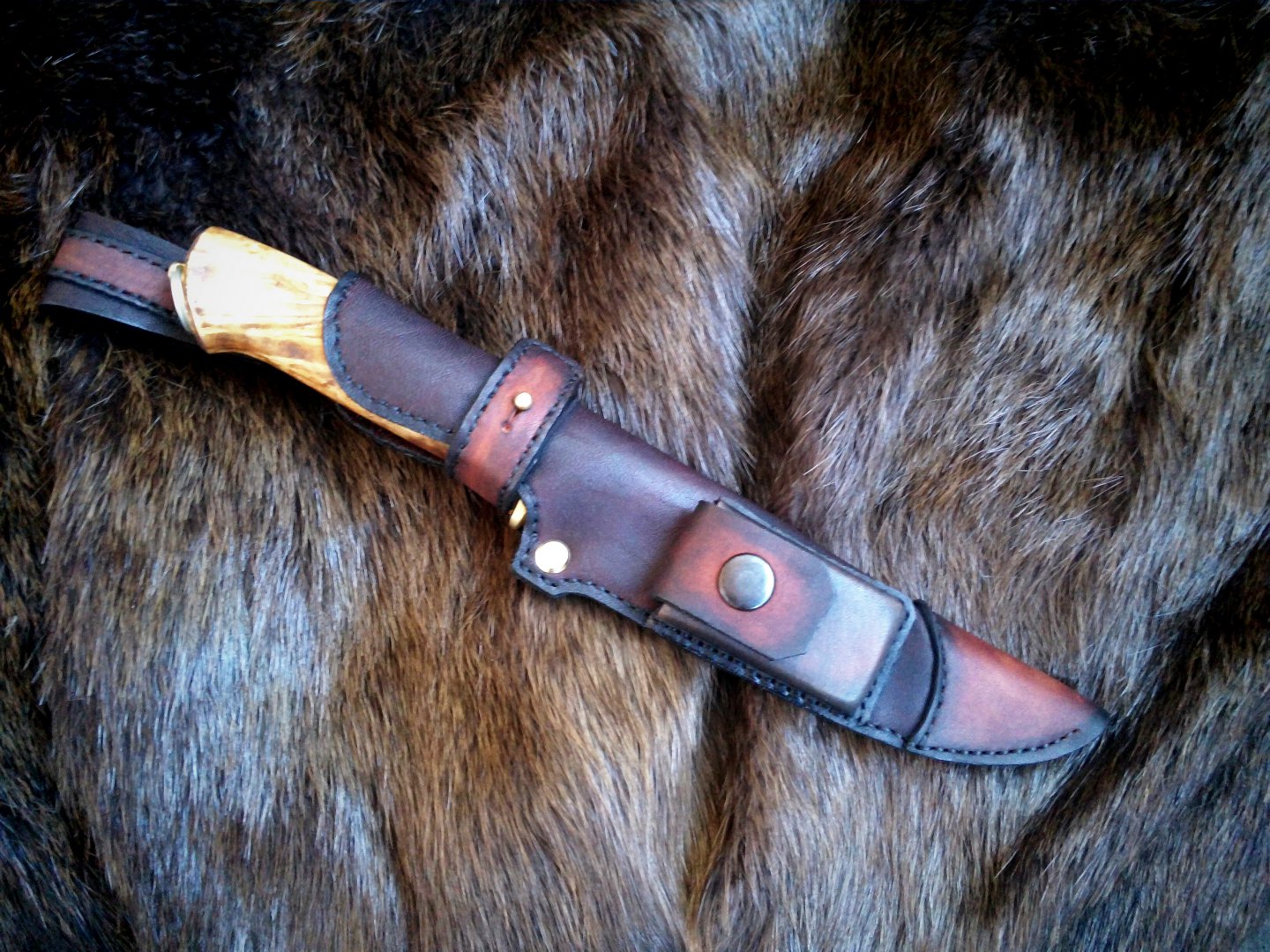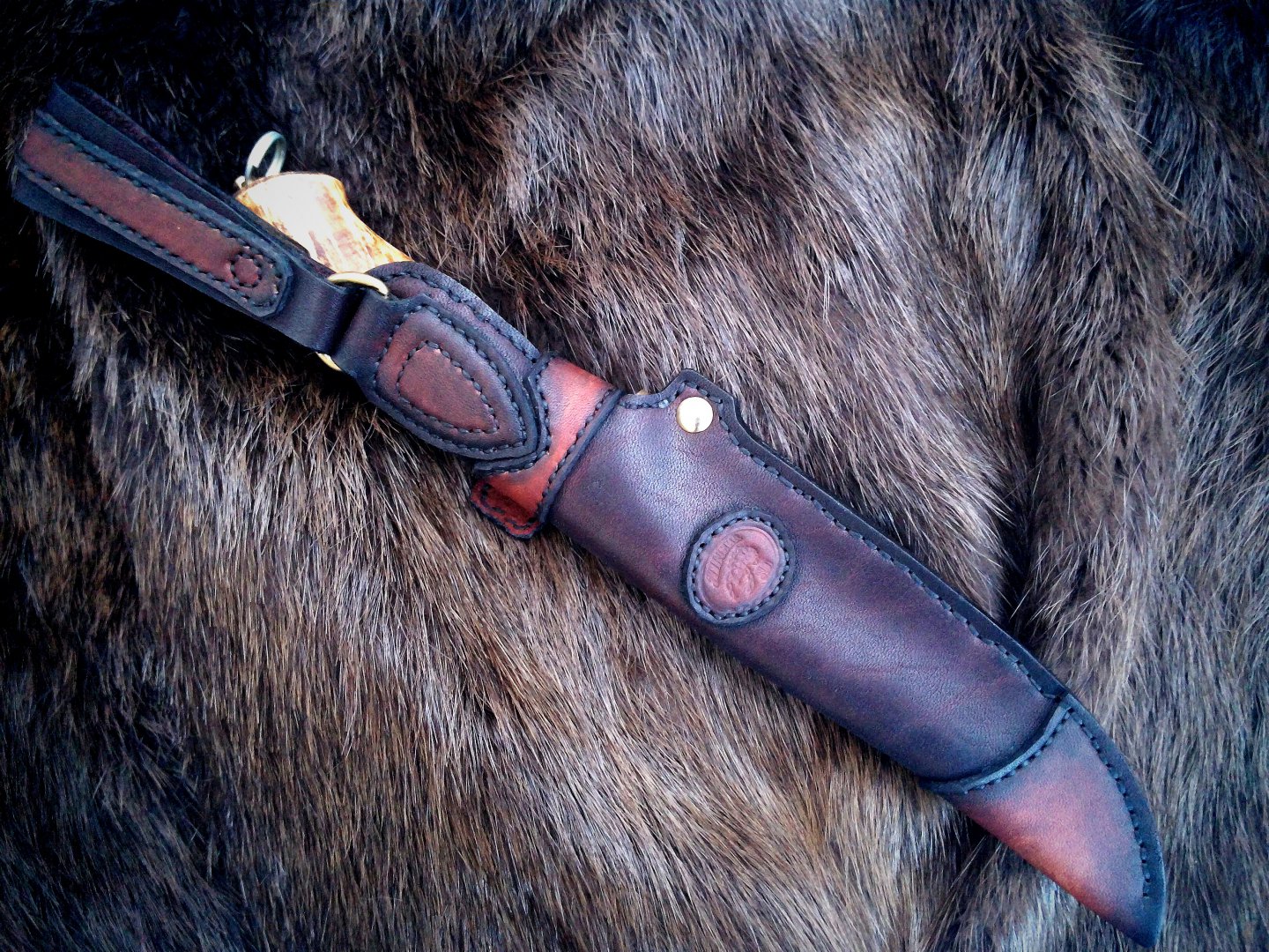 Сталь ELMAX. Рукоять бронза, кап клена тонированный, покрыт Датским маслом. Антабка бронзовая. Ножны кожа. Попробовал отформовать карманчик для открывашки, а то раньше просто пришивал кусочек кожы, потом проблематично было доставать открывашку.