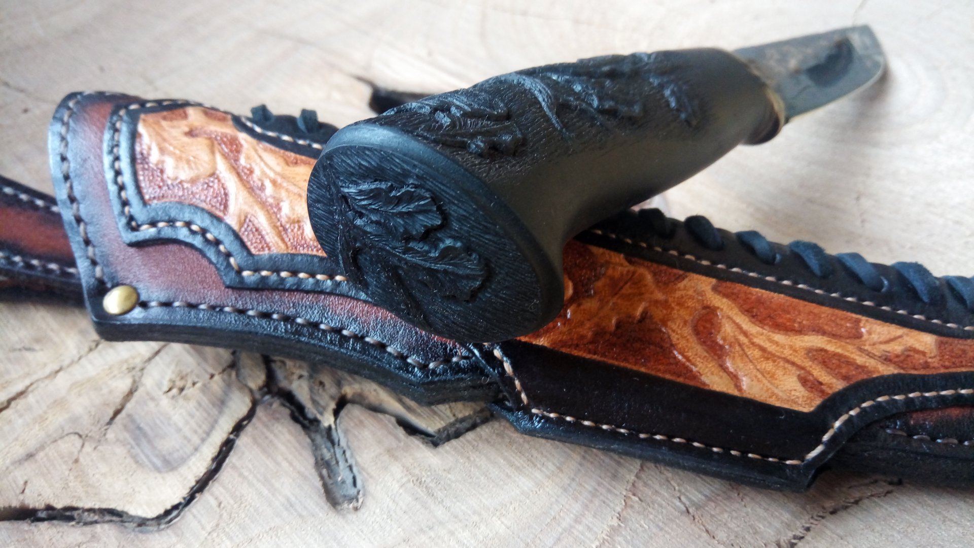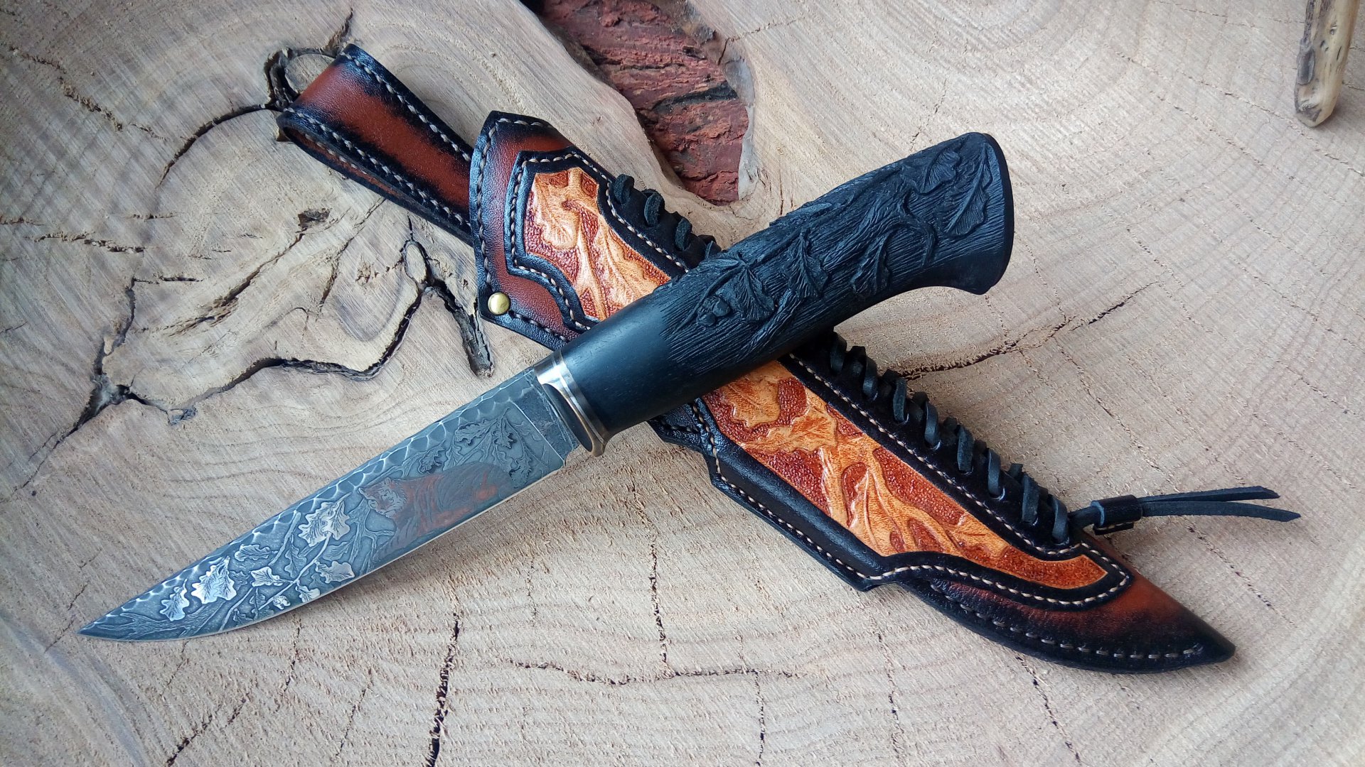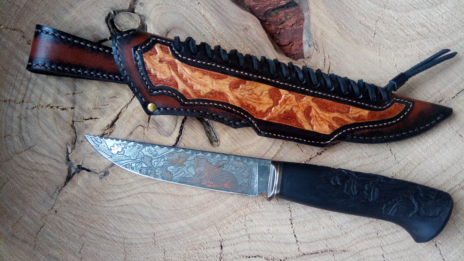 Сталь N 690, рукоять бронза и граб. Как обычно травление, резьба. Ножны натуральная кожа, тиснение и всё такое.