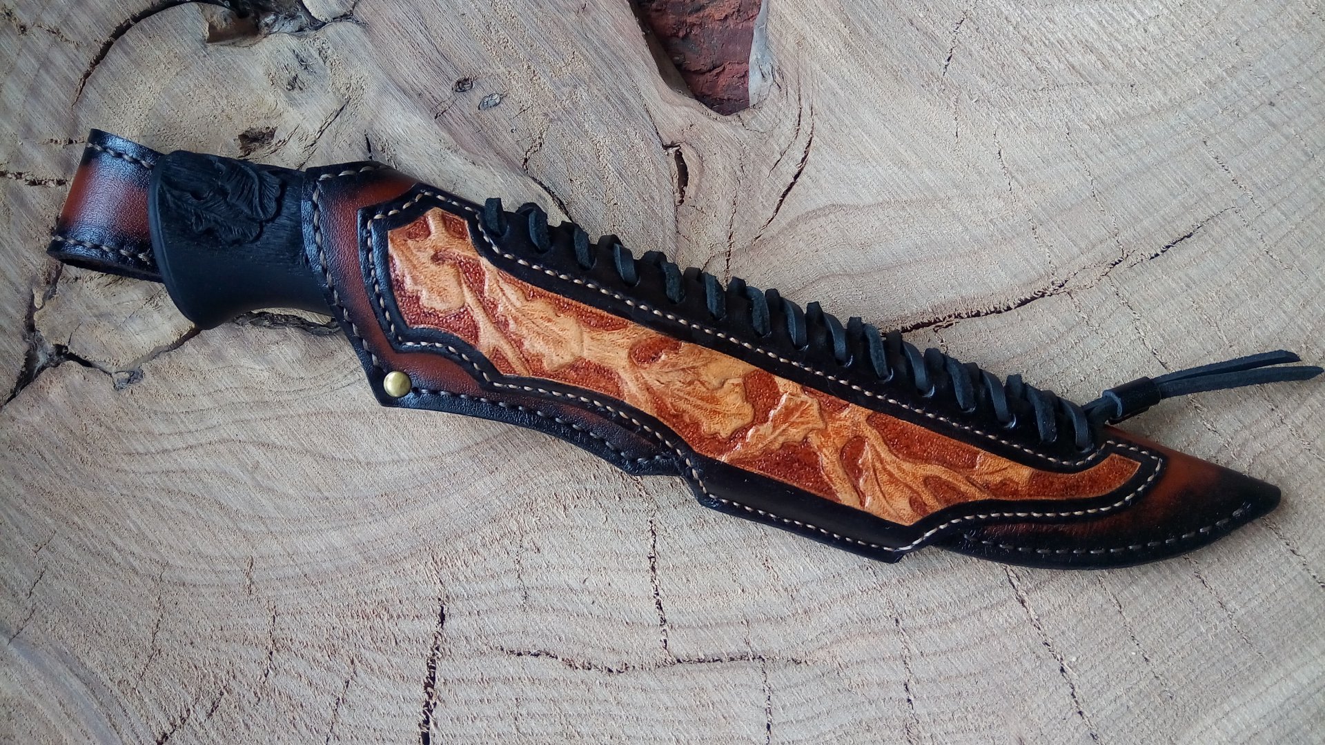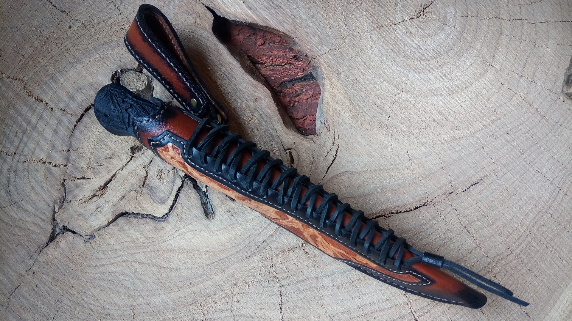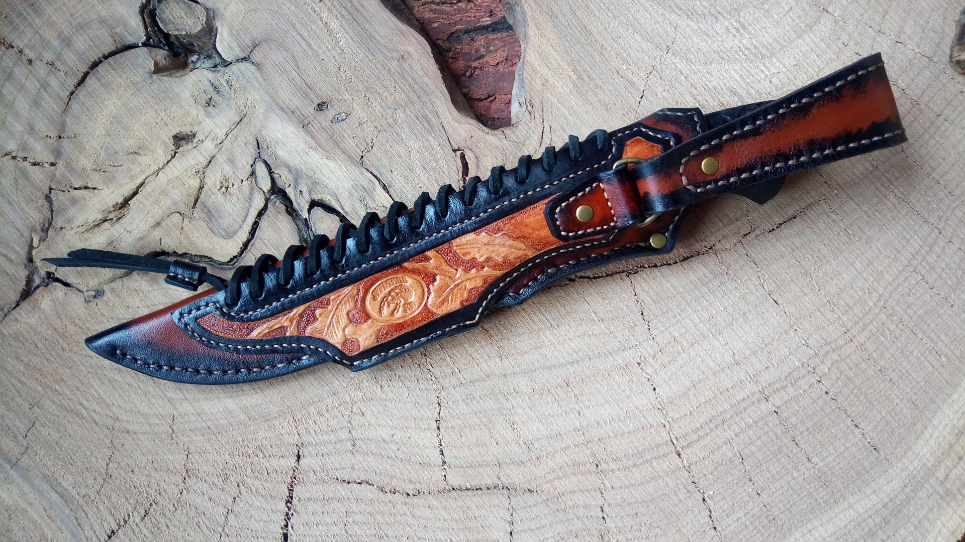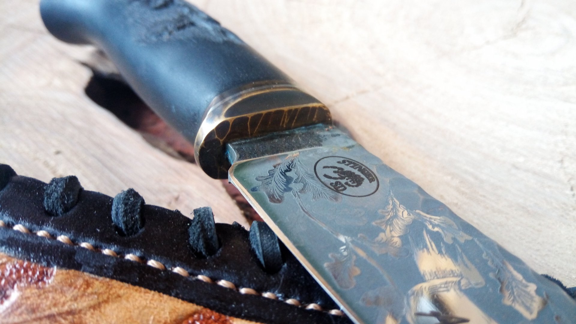 Сталь N 690, рукоять бронза и граб. Как обычно травление, резьба. Ножны натуральная кожа, тиснение и всё такое.
