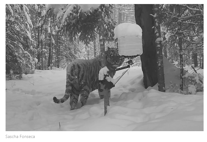Фотоловушка делает не один кадр, просто дубли не совпалиПонятно, что не без обработки, но фото разные. 2 дерева справа от тигры на одном накладываются друг на друга, а на другом нет. И поза у самой тигры разная. Возможно на ч-б фото как раз и попала фотоловушка, с которой сделан цветной снимок.
