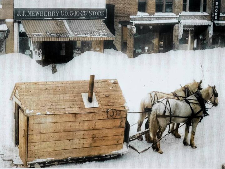 Штат Мэн. США. 1950г. По виду похоже на баню. На самом деле это школьный автобус. Конная тяга и печное отопление.