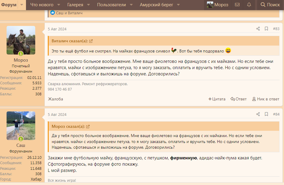 Да у тебя просто больное воображение. Мне ваще фиолетово на французов с их майками. Но если тебе они нравятся, майки с изображением петуха, то я могу заказать, оплатить и вручить тебе. Но с одним условием. Наденешь, сфотаешься и выложишь на форуме. Договорились?