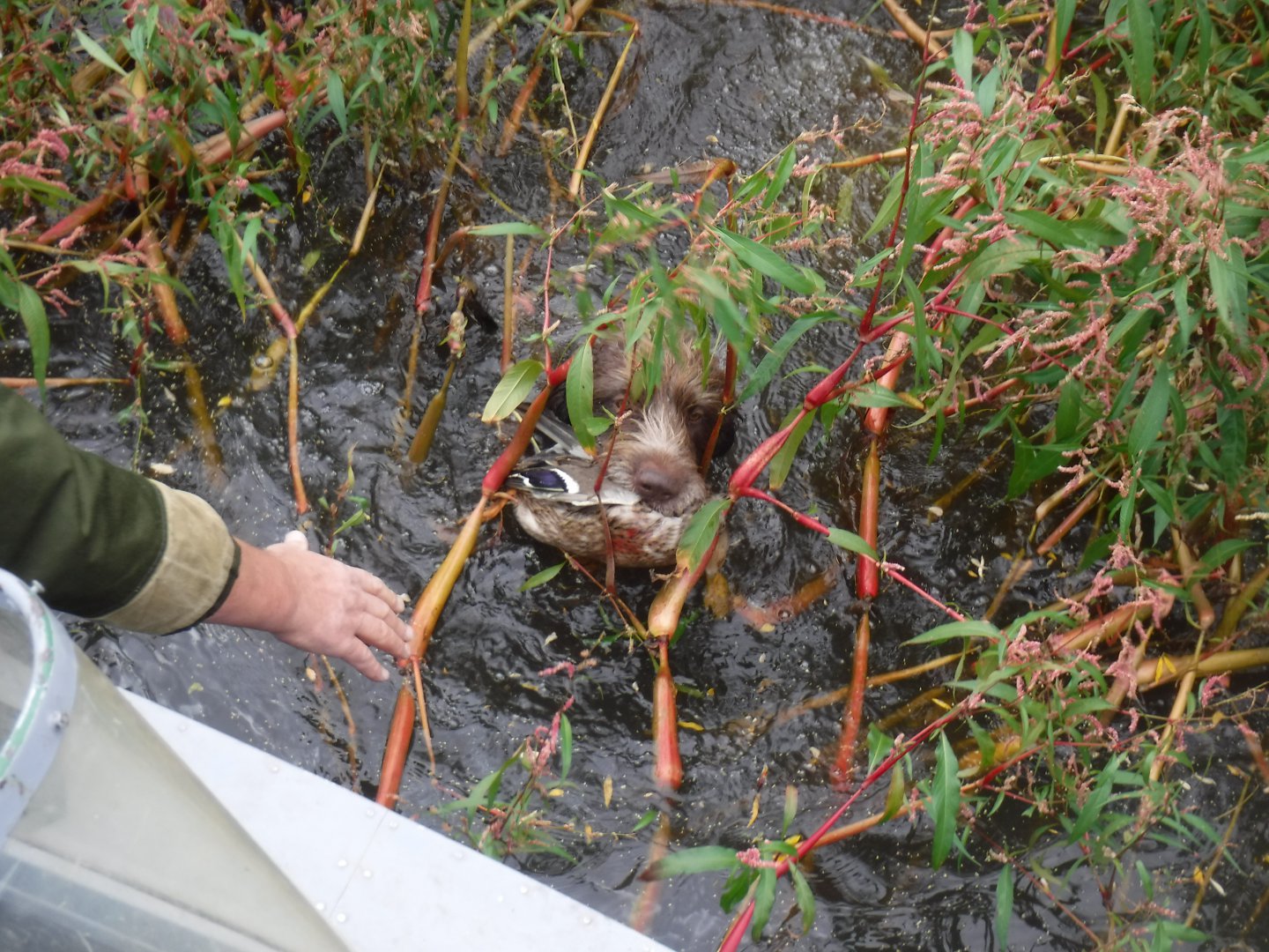 Все подходы к озерам залиты,так что собаке приходится помогать.Если бы не собачка потеряли больше 50% уток