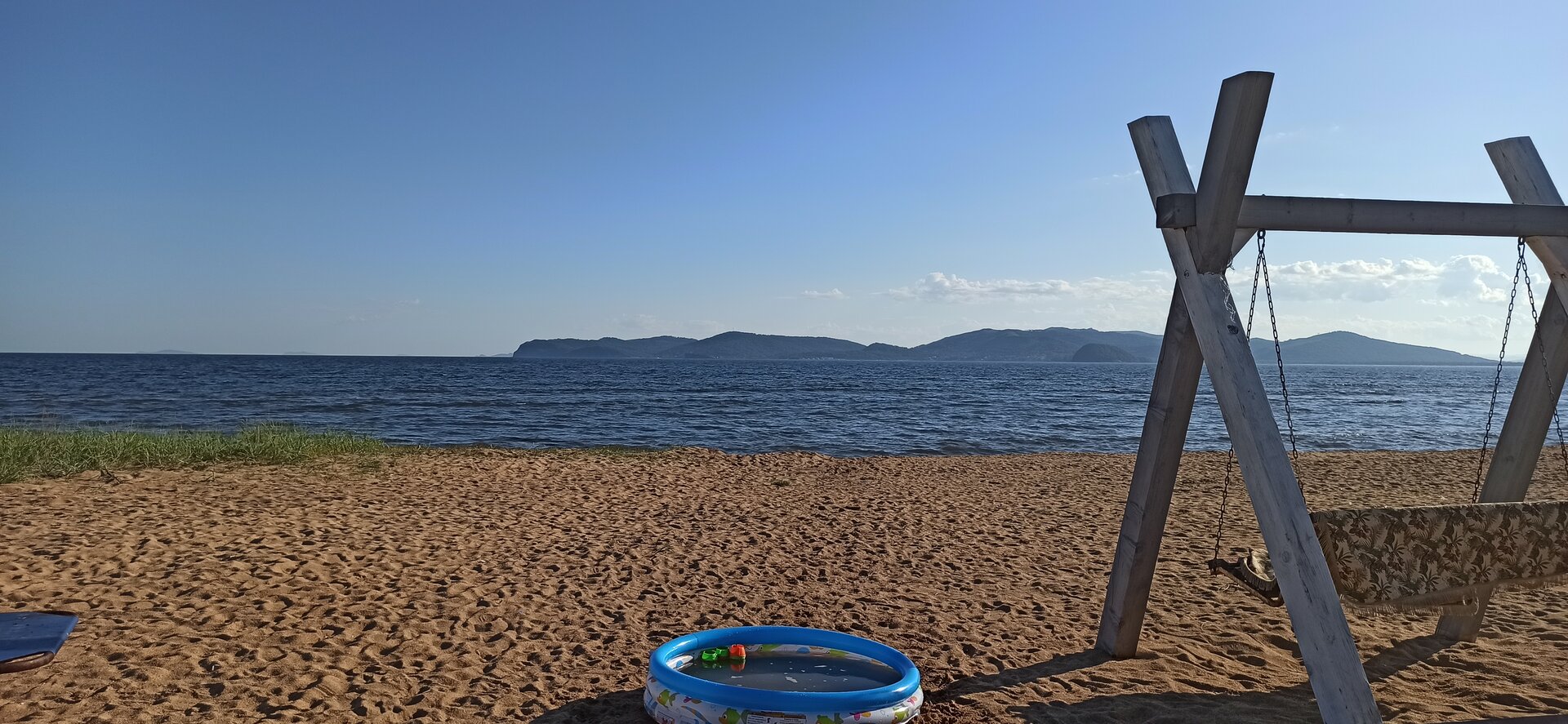 Есть, но не надолго, косу напротив поселка промыло при наводнении и теперь её длина 20 метров. В середине поселка, под створой, к выходным палатки будут в третью линию от воды стоять