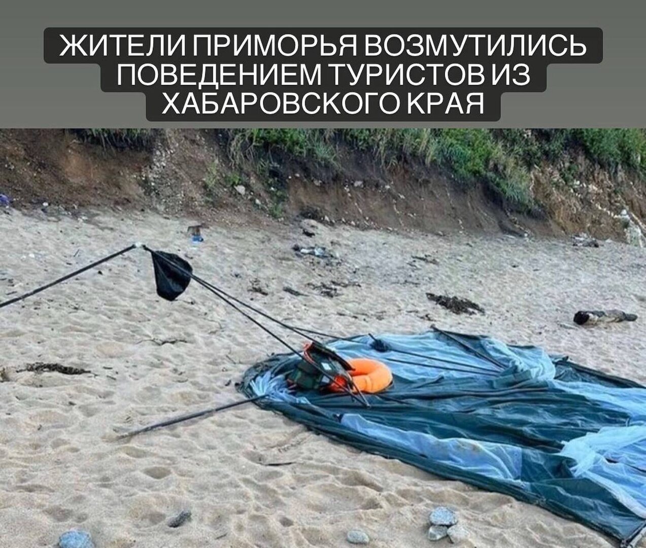 Посмотреть вложение 354250 "Туристы из Хабаровского края приехали в Приморье, чтобы отдохнуть на побережье. Компания из нескольких человек обосновалась на пляже в палатках в поселке Южно-морской. Проведя около пяти дней у моря, гости уехали, оставив после себя кучи мусора: коробку из-под фейерверков, поломанные остатки палатки, столы, стулья, масло в пакетах, надувной матрац.