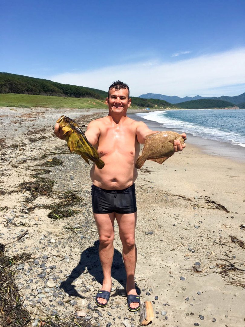 Когда прикупил ружье, то стало охотиться намного проще. Здесь в трофеях уже были и камбала и окунь. Кстати на окуня глубоко нырять не надо. Он обычно обитает среди больших валунов и стаями.