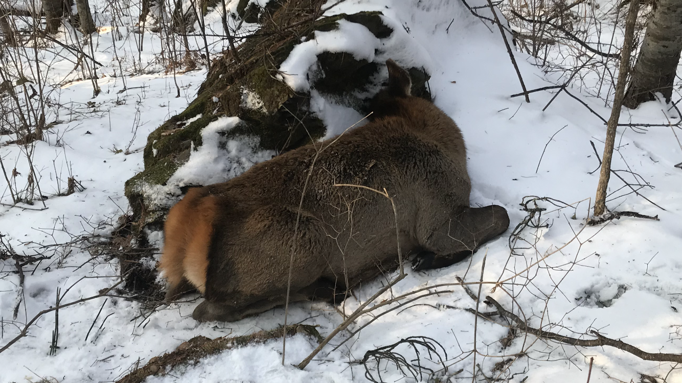 Ошибаиси. Как раз попадание по месту. Но это другая история. Видишь зюбряк голову прячет. Уснул он на лежке и вспышку проспал.Поза подранка,попадание в брюшную полость