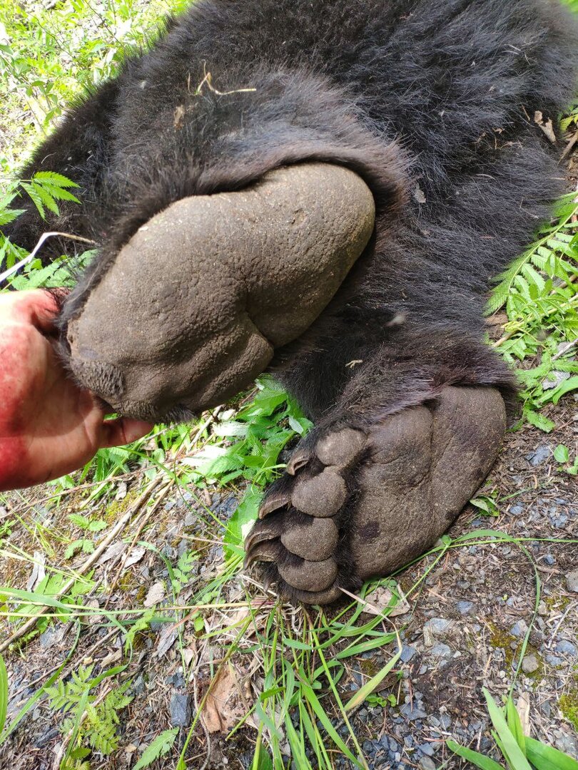 Я думаю , попался он в соболий капкан будучи медвежонком . Лишился пальцев и в дальнейшем стопа формировалась без них , ибо очень уж она аккуратная с хорошими опорными мозолями в местах бывших пальцев .
