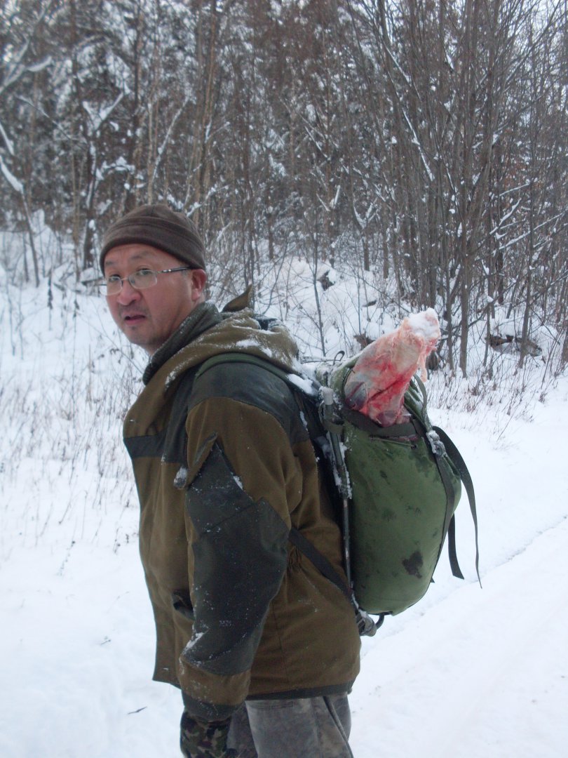В продолжении темы. Зима, как обычно пришла внезапно, и сезон охотничий тоже. Понятен фикус- ничего я лето с рюкзачком не делал, хранил в нем всякий скарб-в основном охотничью обувь. А так как, обязанность по выноске добычи никто с меня не снимал, то из разных рюкзаков, мешков с веревочками и просто веревочек, конечно, пошел в дело "зелененький станочек". Добыча- благородный олень, годика 4.