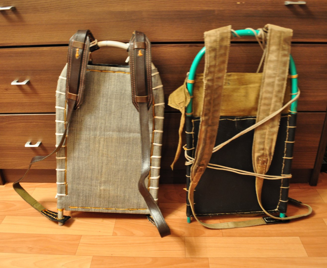 Рама - это лыжная палка, гнулась вручную с песком без нагрева по кислородному балону. Тесемки, карабинчики, капроновые нитки, эпоксидка, капролон не нужно объяснять где взять. Сумки - или с радиостанции военной, или вещь мешок. Лямки - с разгрузки.А материал из чего взят? Как трубы гнули с песком в ручную?