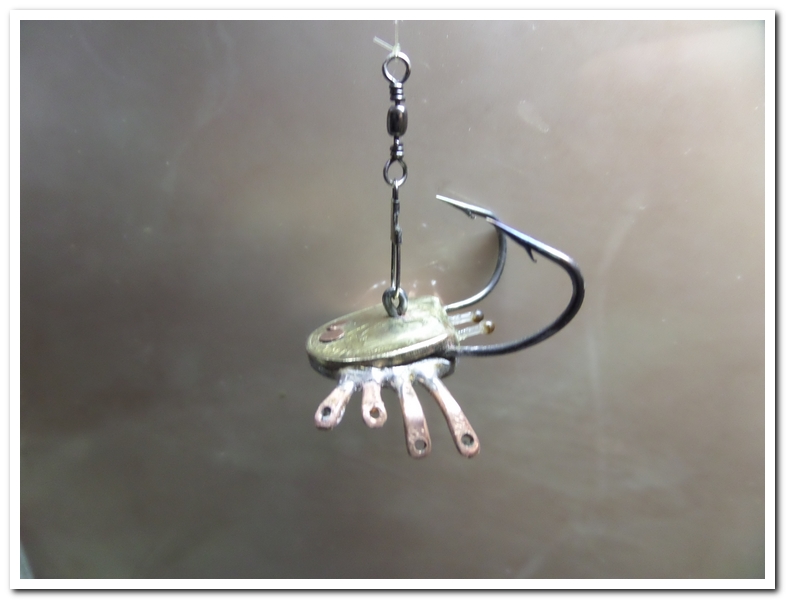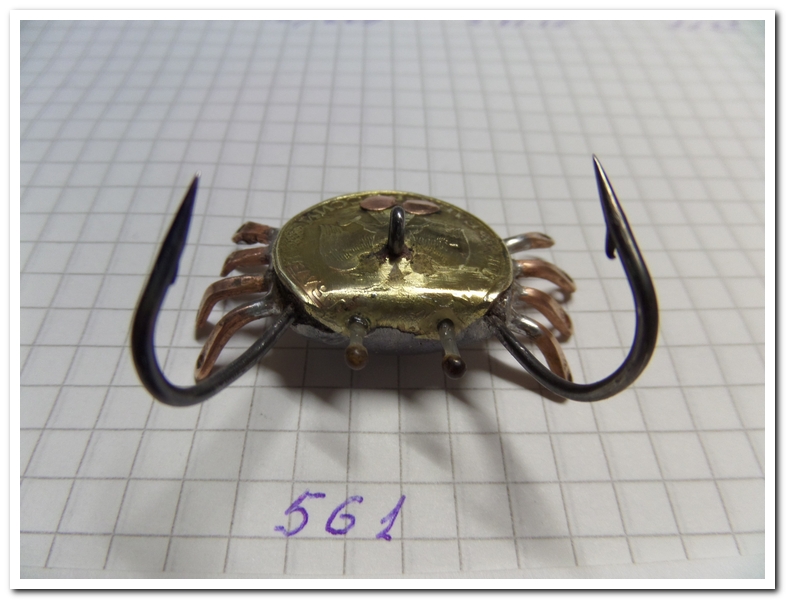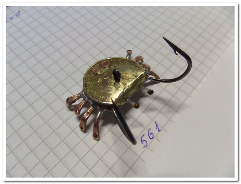 Латунная монета (старые 50 руб.) - это спинка. Чуть выгнул ее. Загнул краешек в голове. Приклепал два крючка 12 в качестве "клешней". В гипсовой форме вырезал углубление для тела с таким расчетом, что бы передок был потолще, и панцирь крабика имел к заду уклон. Залил форму свинцом и припаял пролуженный снизу панцирь с крючками. Ножки сделал из медной проволоки 2 мм., припаяв их в сделанные выемки. Была задумка сделать лапы подвижными на колечках. Но при монтаже выглядело не очень. Поэтому оставил так. Ну и в завершении петелька из обломка крючка по центру тяжести и глазки из мм. лески, вклеенные в просверленные отверстия.