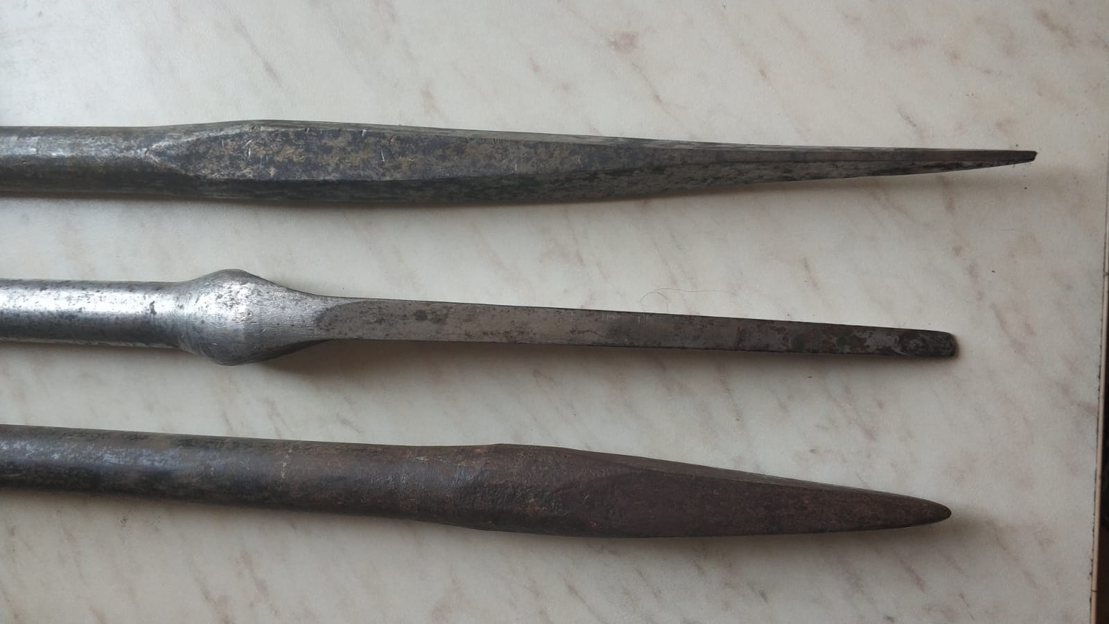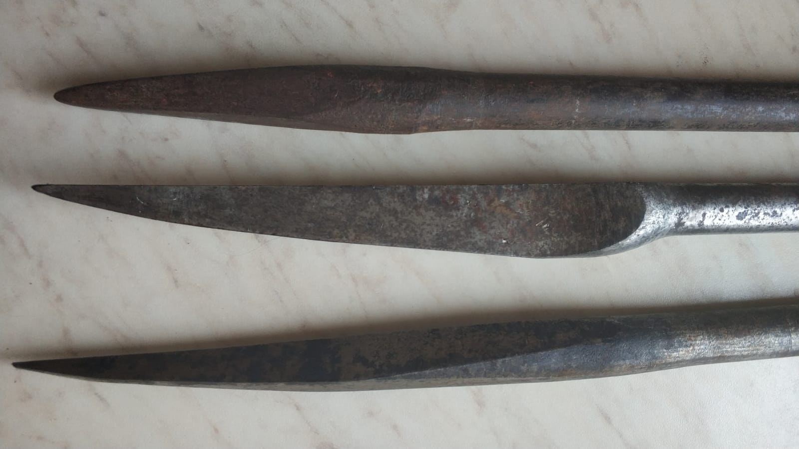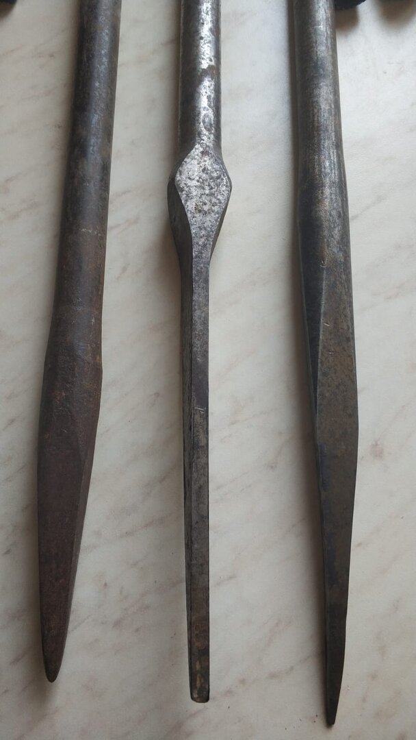 Что вы так прицепились к этой пятке. Два сезона работал самодельной пешней, никакой пятки на ней нет, но лед долбит отменно. Нашел несколько фото. Одна чистый лом (сосед ей лед долбил), вторая "неизвестная пешня" (нужно привести в порядок и попробовать), а вот третьей трехгранкой как раз и делал лунки. Проблем не заметил