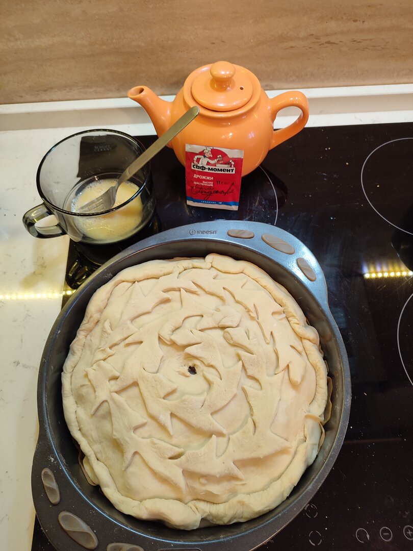 Пирог закрываю, украшаю, дырочку не забываю в серединке проковырять.