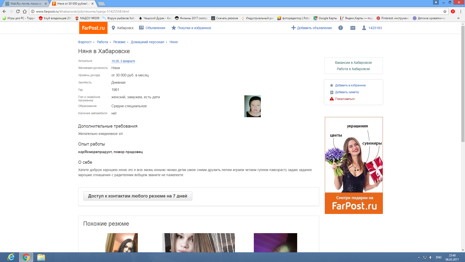 Что то меня на объявления потянуло) Кому няня нужна, налетай. СУПЕР НЯНЯ. Читаем о себе)) http://www.farpost.ru/khabarovsk/job/resume/njanja-51425558.html