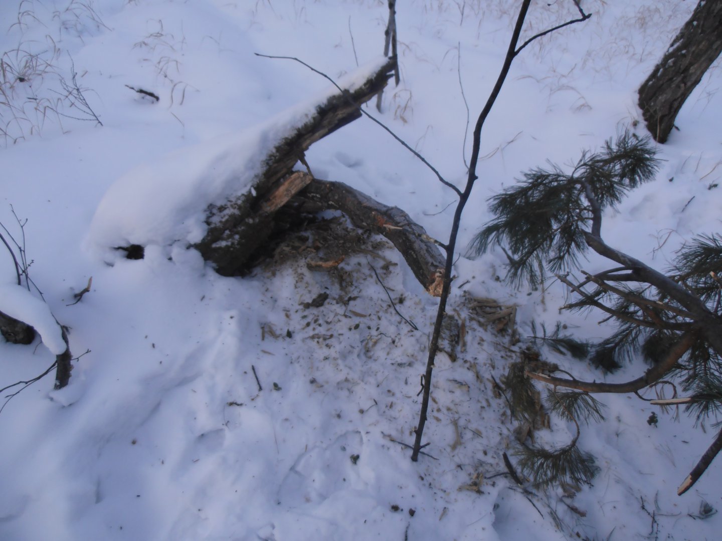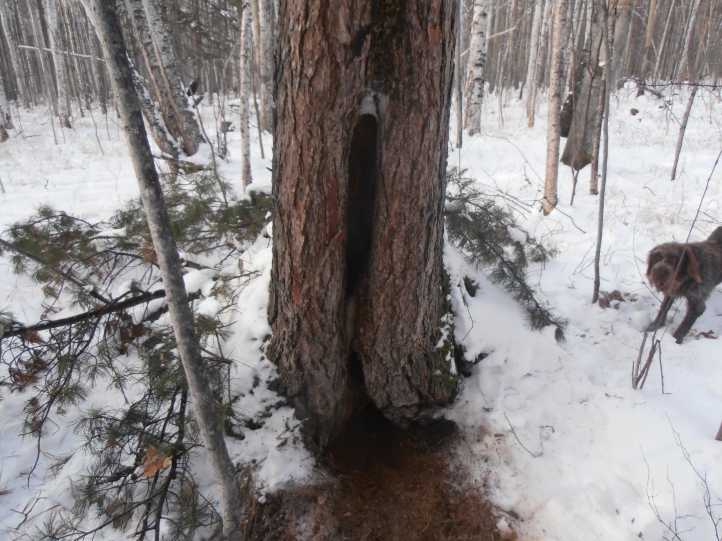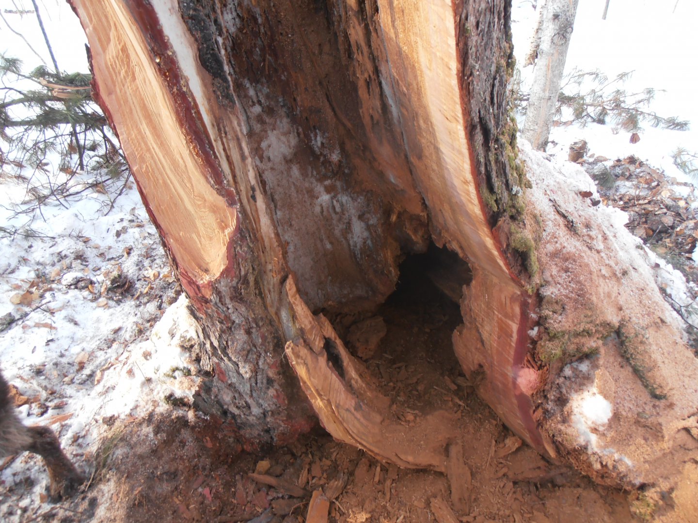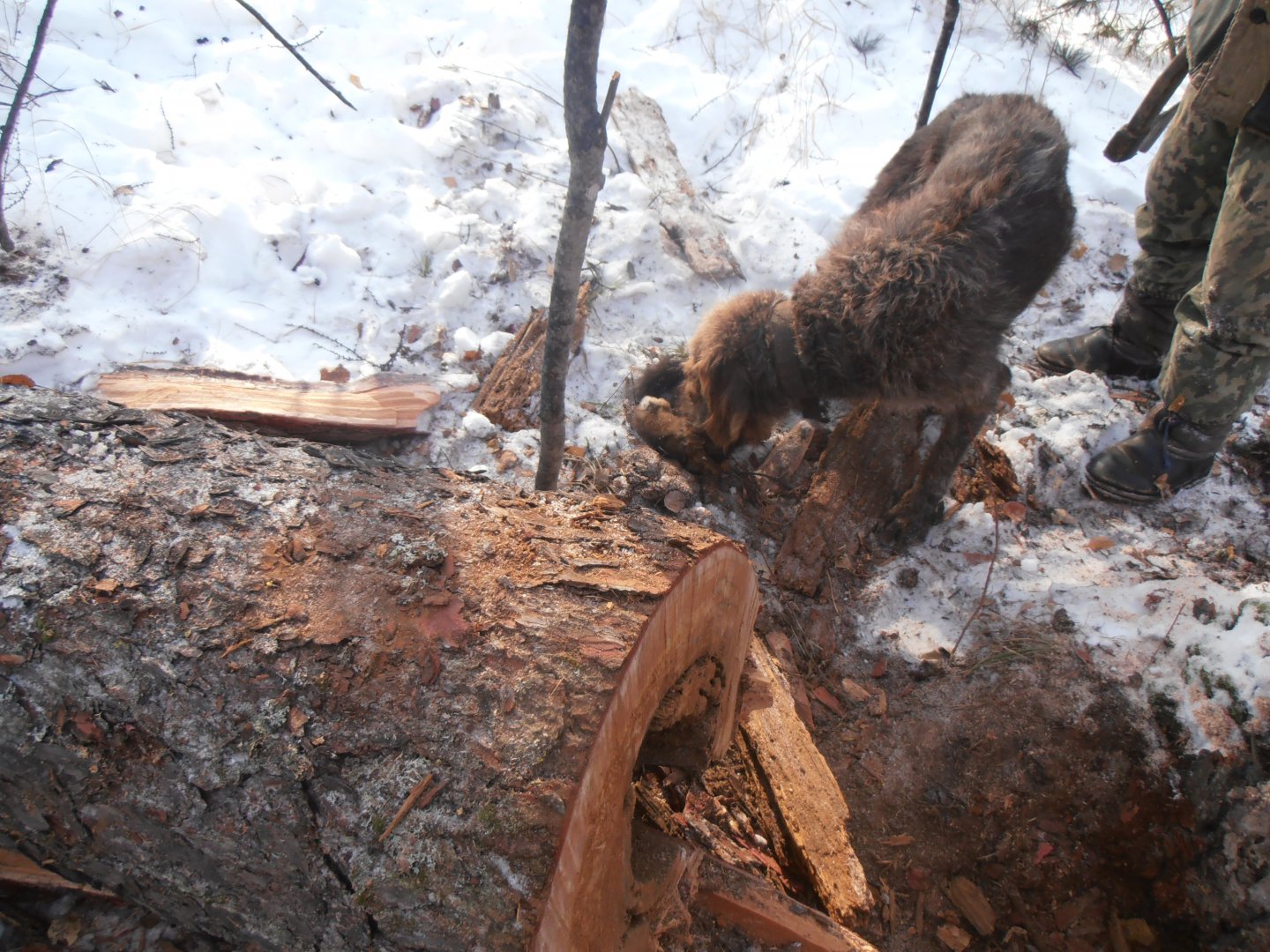 Бакс обследовал пустотелый ствол и инициативы не проявляет,упорно лезет в корни.Значить соболь там и расширяем вход.Наконец пропил сделан и вход к корням свободен.