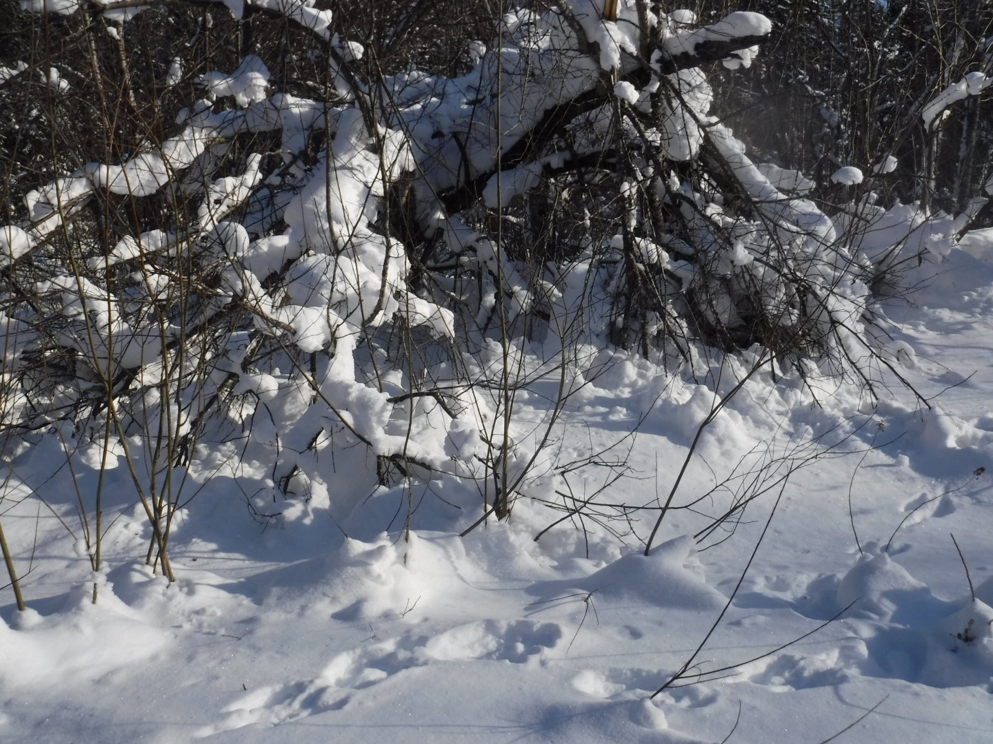 Снег 1-1.20.Идти можно только по засыпанному бураннику,или лыжнице.Как только клювом щелкнул, так и валишься почти по колено.Одно преимущество наледей нет.Рады наверное только зайцы,в пойме речке их собралось немало и попробуй их там взять