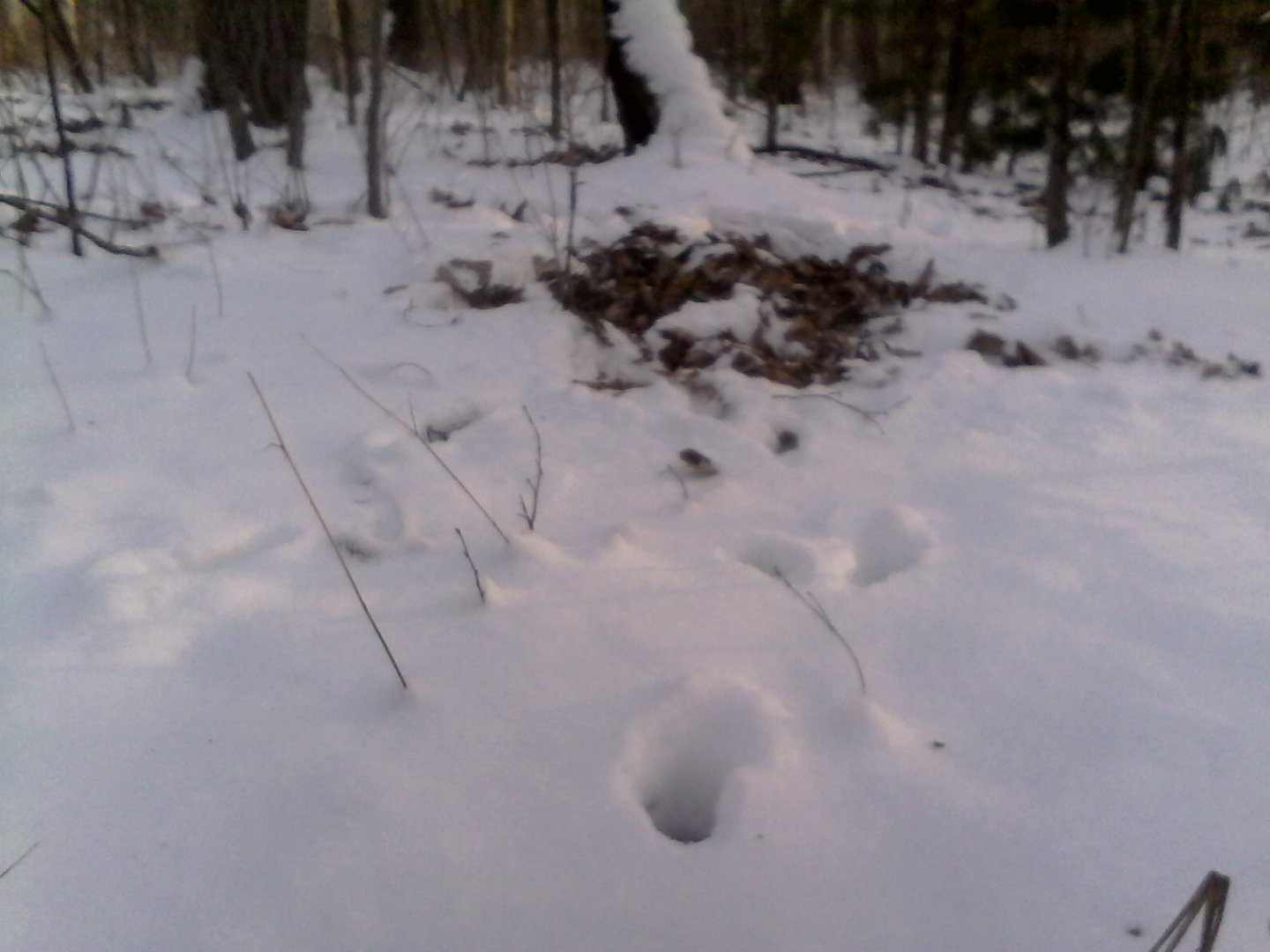 Вчера заходил следов не было, сегодня выхожу - здрассте! Вышел похоже вчера, в 20ти метрах от машины, огляделся, и по моим старым выходным следам ( я захожу по путику, а выхожу по волоку) чухнул. С таким размером можно и борзонуть конечно -