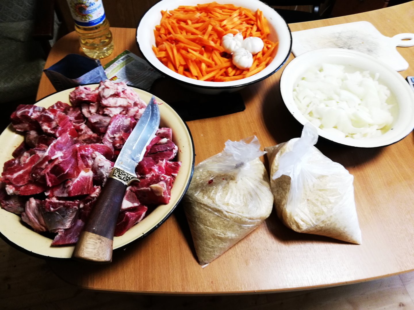 В пятницу один из коллег решил проставиться за предстоящий отпуск. Другой предложил обкатать его новый казан пловом. Сказано сделано. Купили 3,5 кг баранинки, 2 кг лука, 2 кг морквы и 2 кг риса.