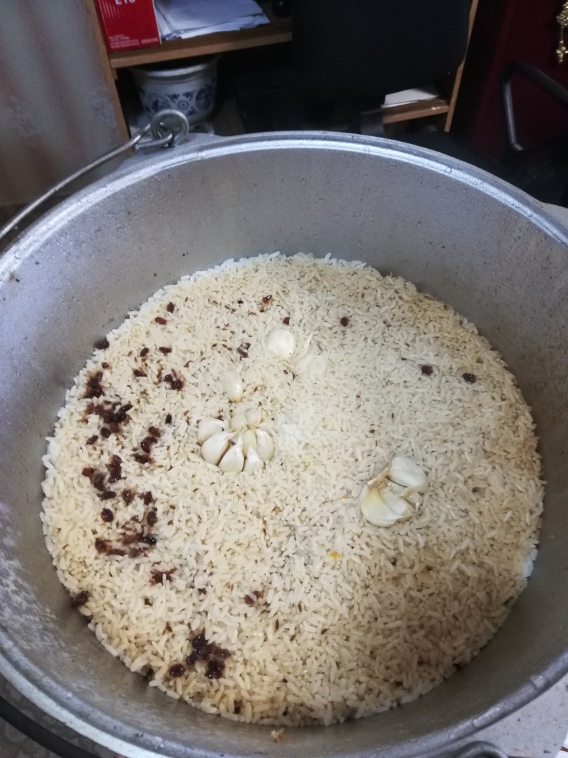 Закладываем рис и заливаем водой. Есть давний спор какой водой заливать рис. Я заливаю холодной. Еще барбариса, еще растираем зиры.
