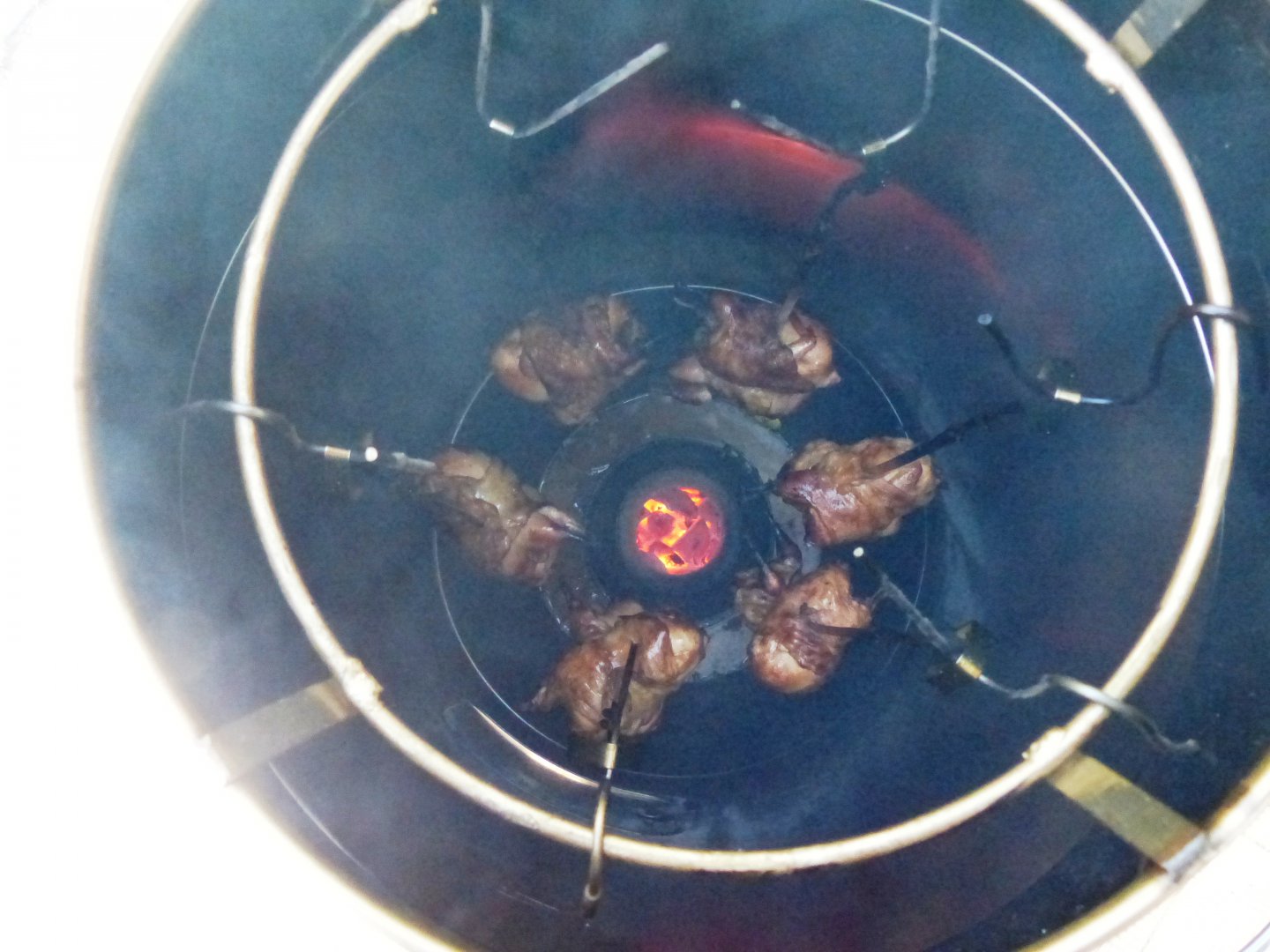 Ну вот кажись и готово. Уложился в 49 минут. Если кому покажется что подгорело, то это не так. Фотал как всегда на бачок от унитаза, поэтому темнит. Вещь нереальная! Аццкая машинка не подвела. Вернулись менты, голубей им не дали, зажарили тех куриц. Одной закладки угля хватило еще часа на три. Счетчик Гейгера ругался еще сутки. Соседи не здороваются да и хер с ними.
