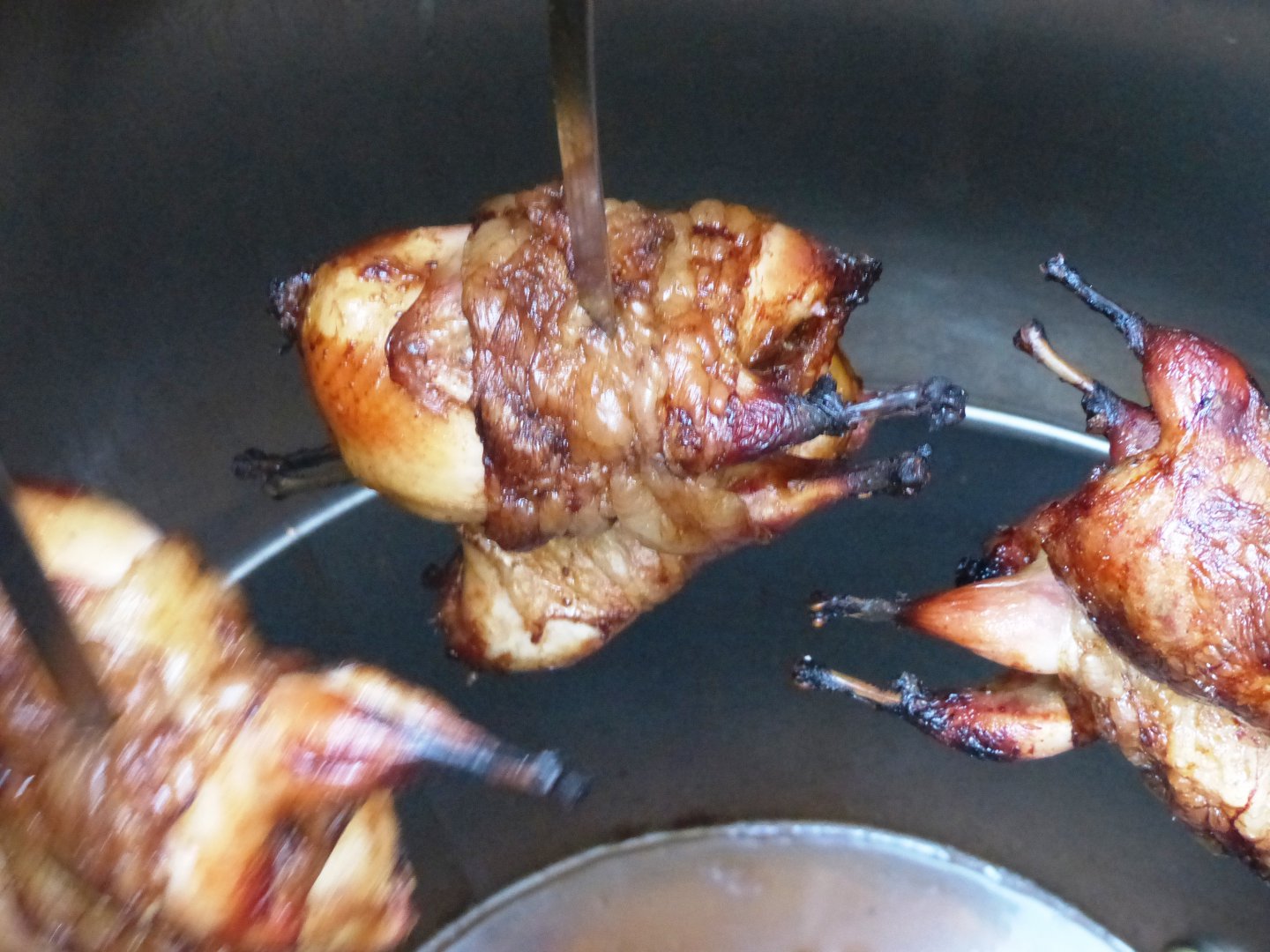 Вешаем назад, добавляем огня. Но! Голубей нельзя запекать более пятидесятидвух минут! В сальнике или без. Это аксиома, и Поль Дюкан воскреснет и придет ко мне во сне если я чего нарушу. Поэтому проверяем каждые три минуты.