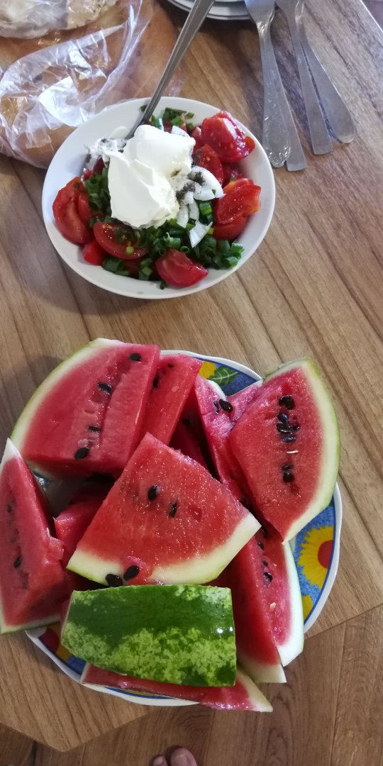 Спелый как мед арбуз. Салат: огурец, помидор, красный салатный лук, зелень, соль, перец, сметана. Лаваш.