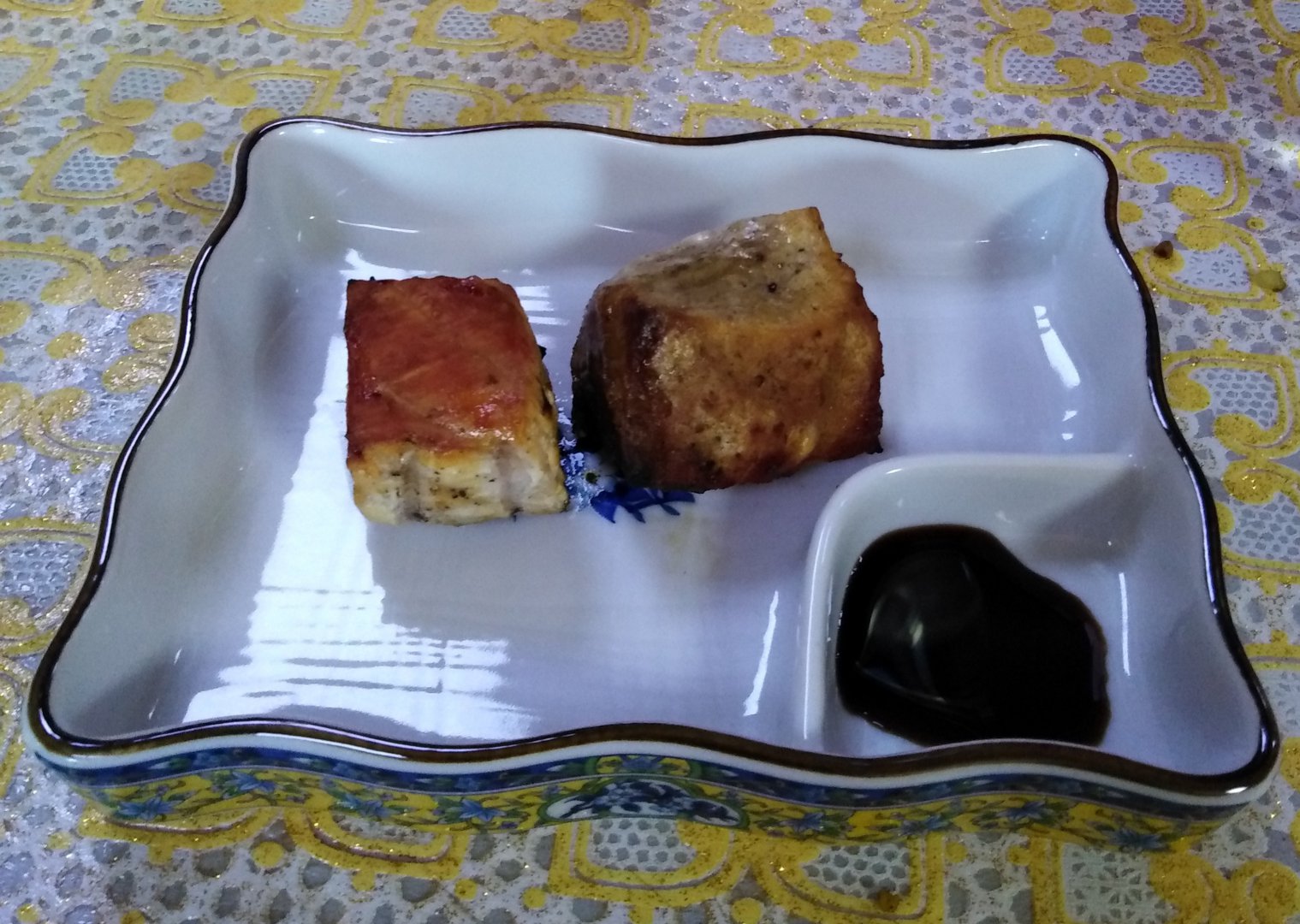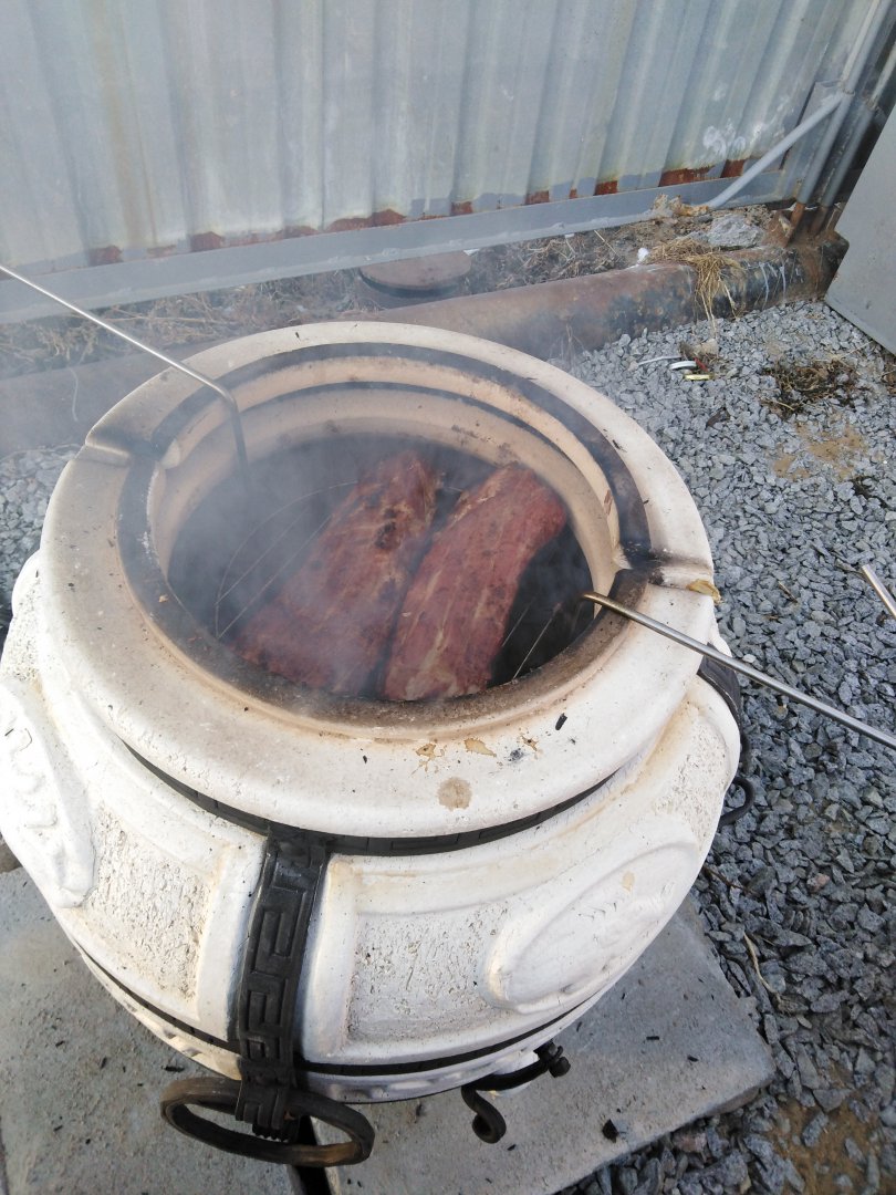 Берём, заранее замаринованные рёбрышки, маринуем белую рыбку, запускаем тандыр
