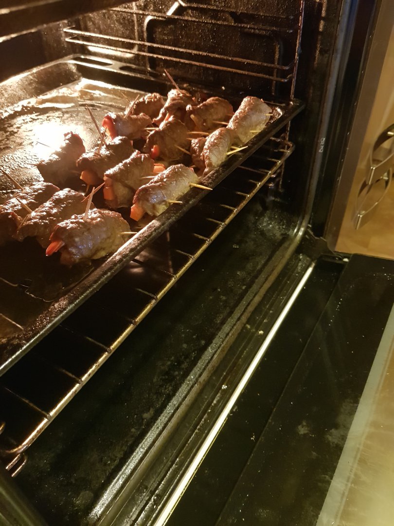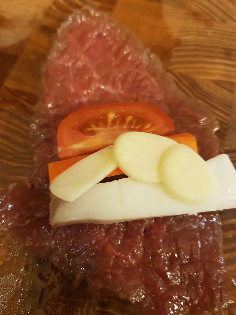 Такую же вещь в воскресенье мутил. Начинка немного была другой только. В рулетики заворачивал чернослив, чеснок, морковь, так же дольку помидора и все вздабривал тертым сыром. Мясо (свинина. шея) предварительно было "избито" и замариновано в кисло-сладком соусе под злой горчичкой... Первое что покинуло стол, это конечно же было мясо. ;)