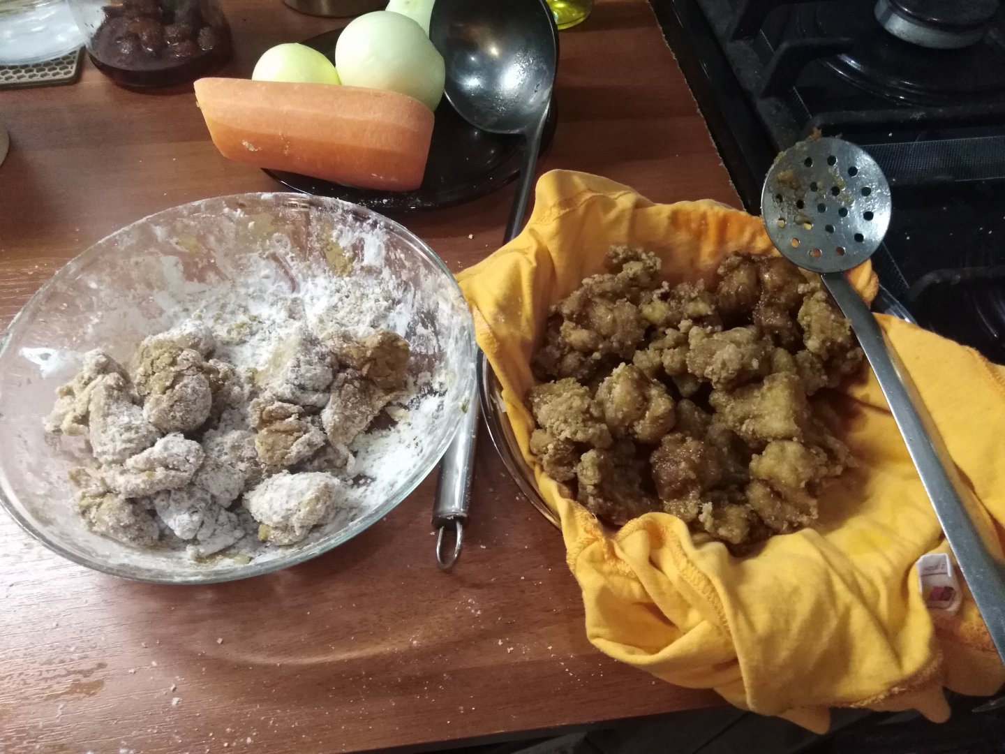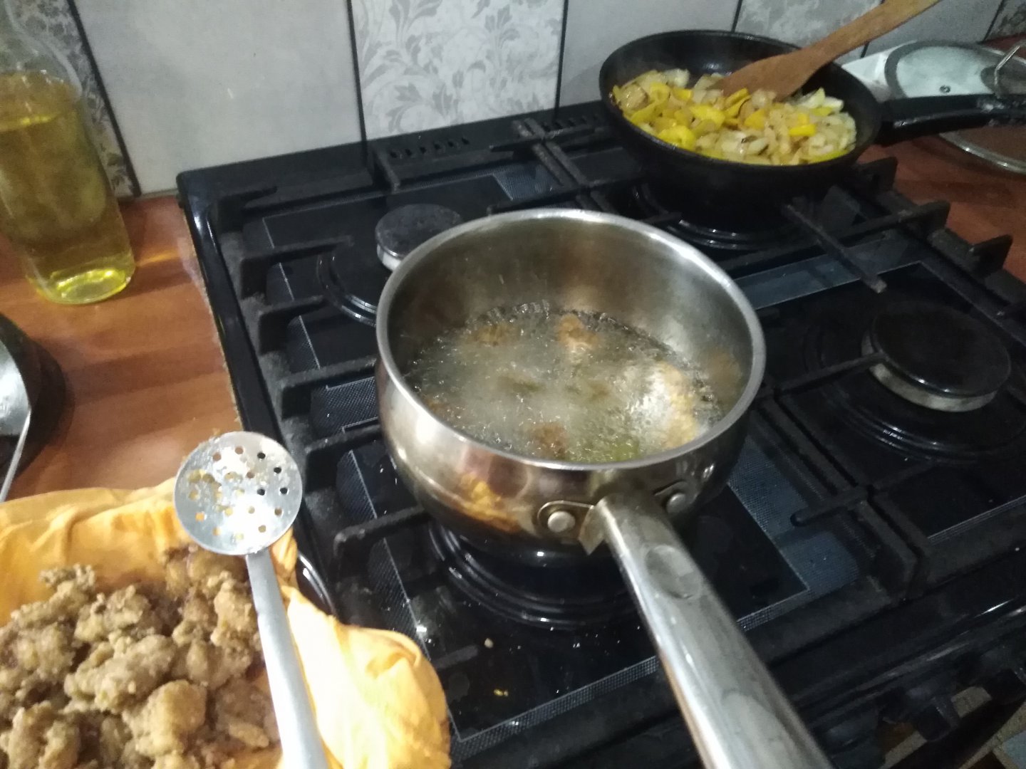 В это время греем растительное масло, после чего ображиваем мелкими партиями мясо в кипящем масле и выкладываем его, либо на салфетку, либо на тряпочку.