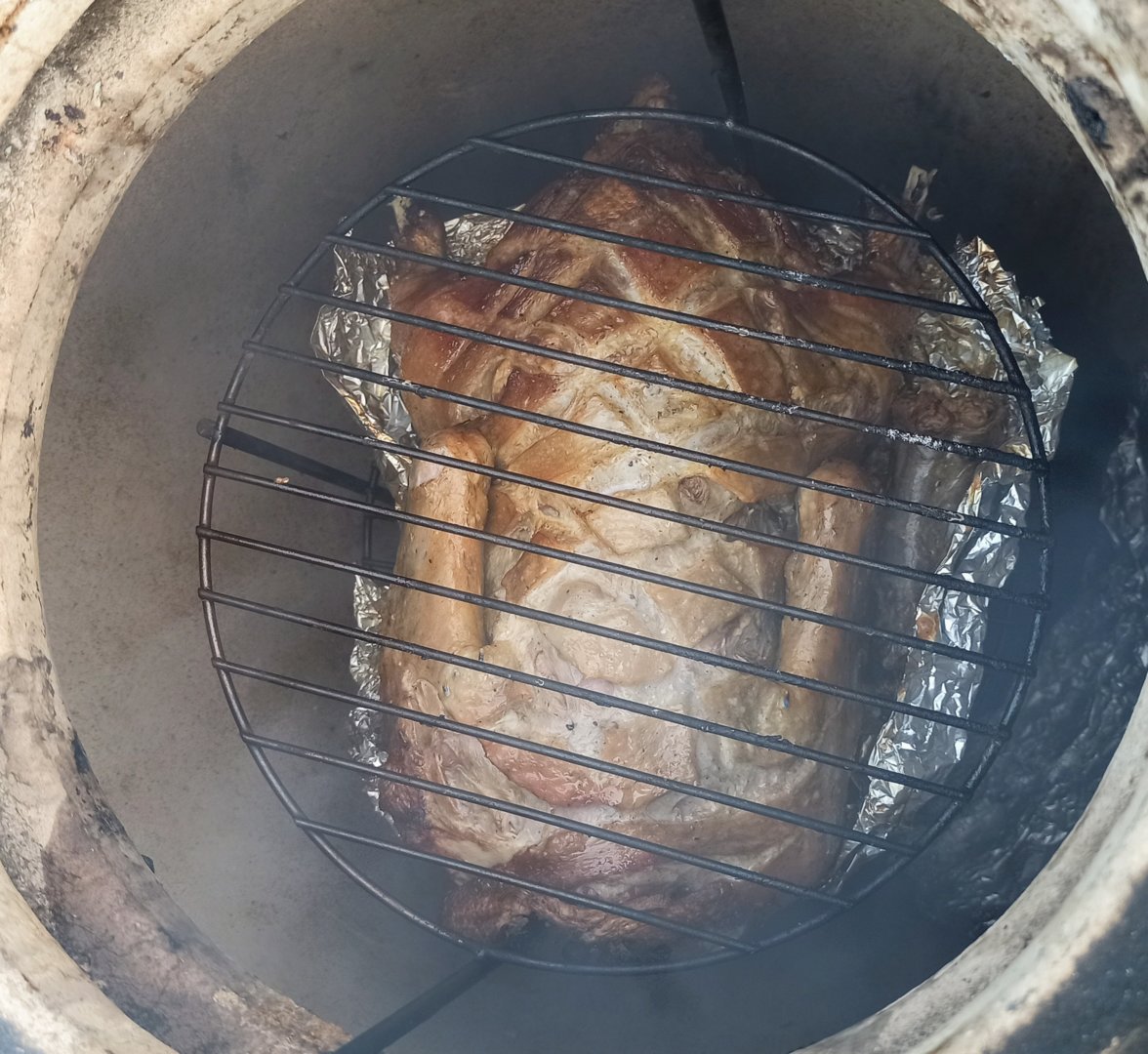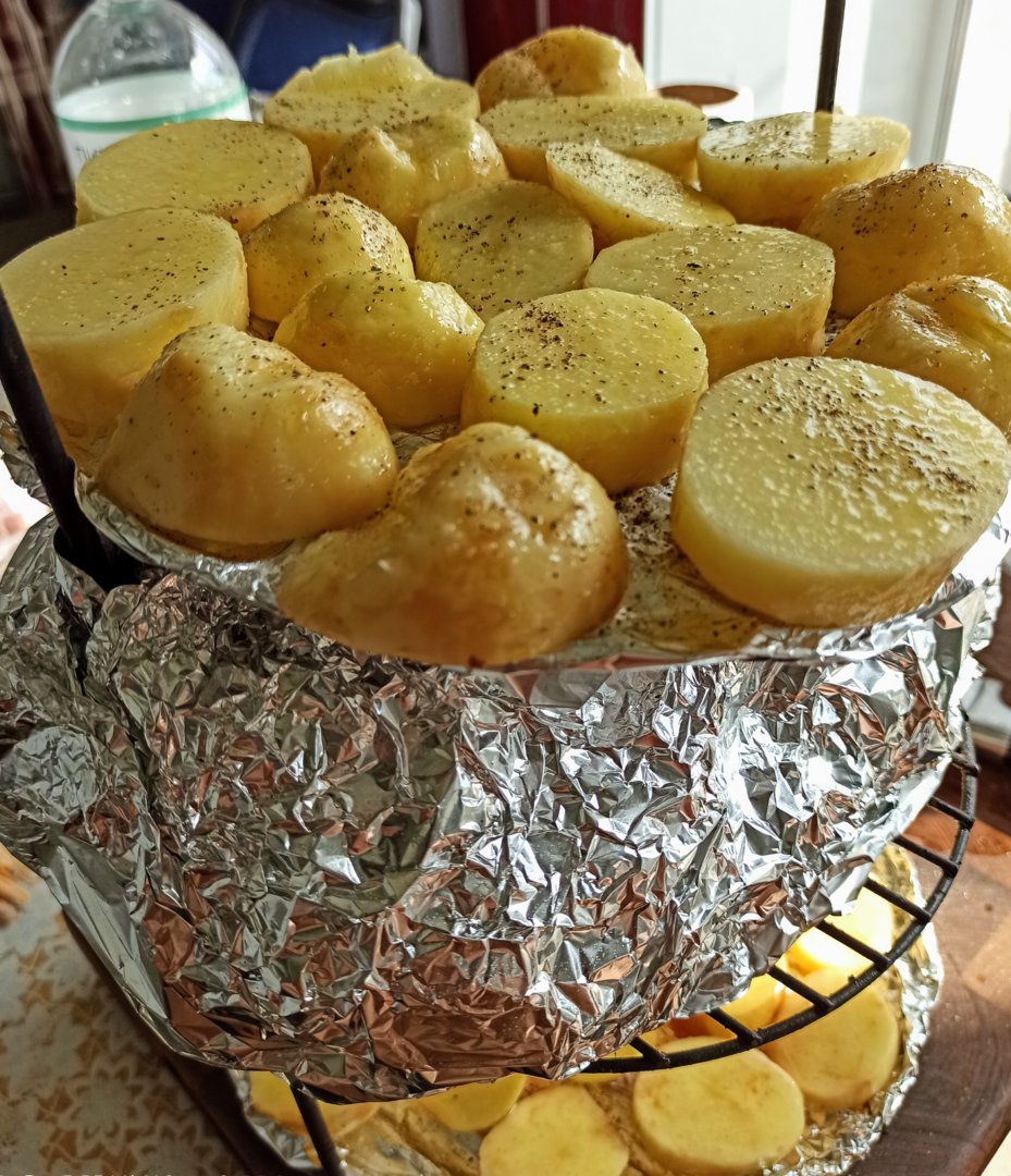 Нарезал молодой картохи, посолил, поперчил, уложил на решетку. Достал уточку из холодильника, на решетку и фольгой укрыл.