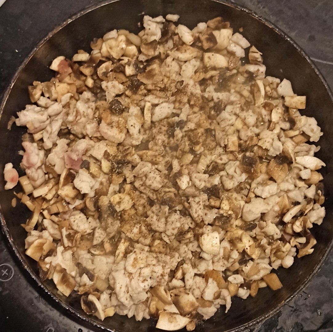 Обжариваем грудку, затем добовляем шампиньоны