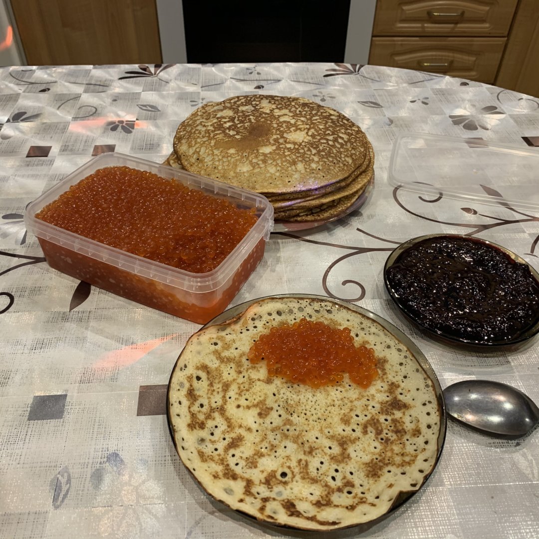 Кстати, Сковорода большую роль играет и нужно подобрать степень нагрева, и тогда как по маслу, я даже приноровился без первого блина который комом))