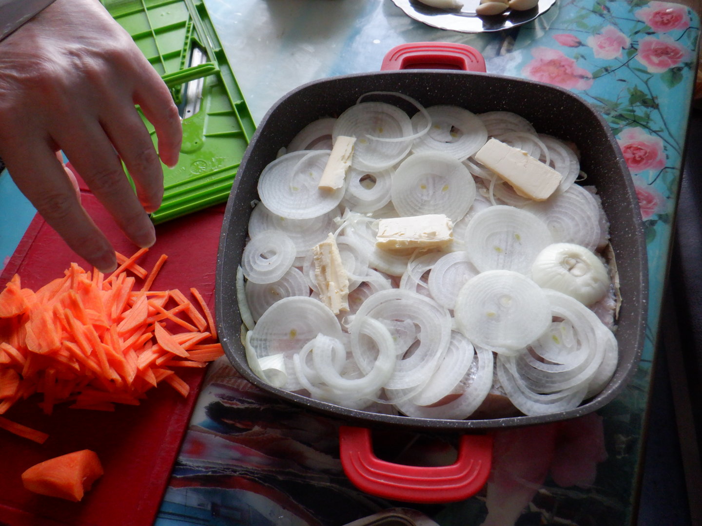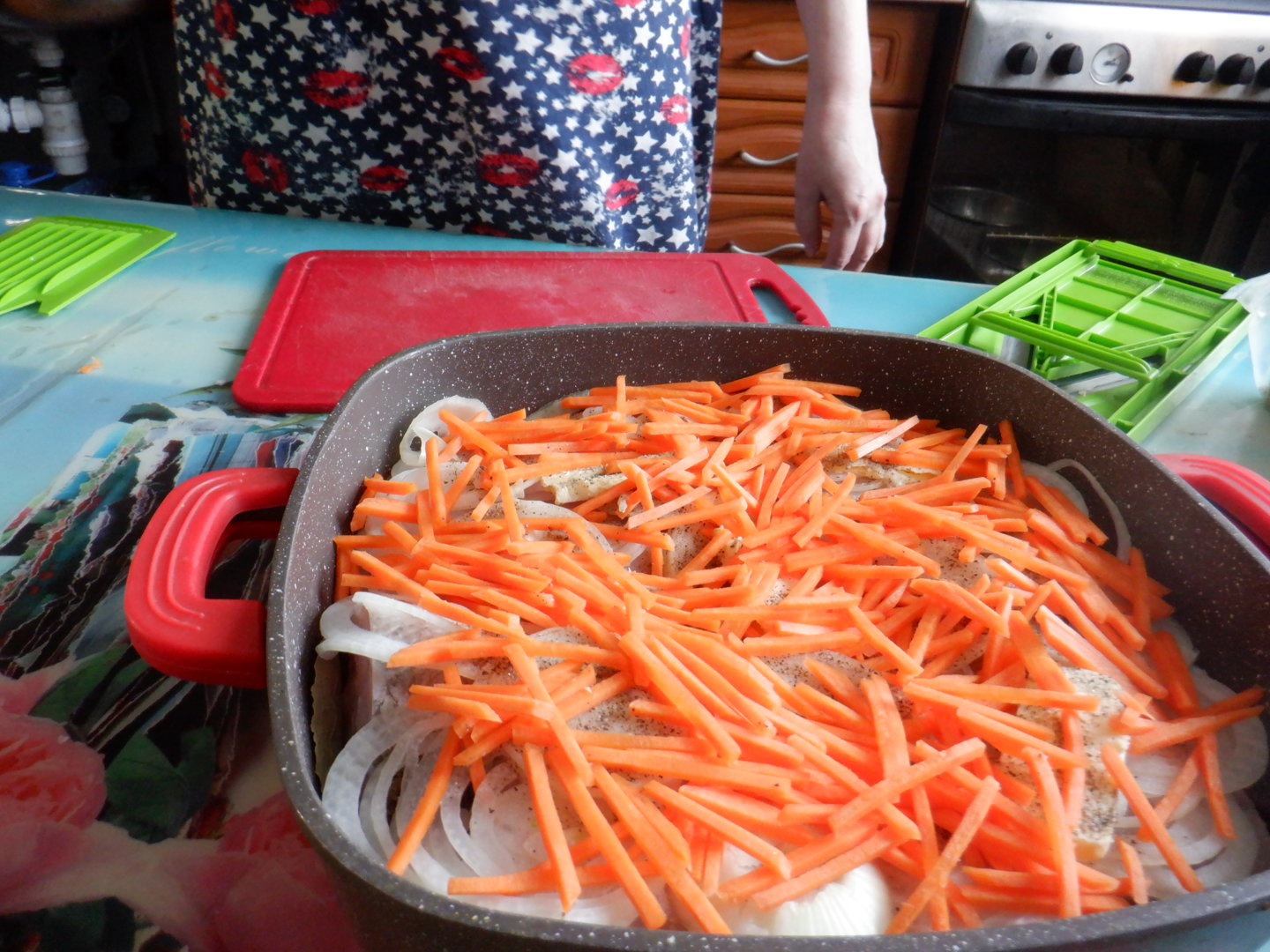 солим,перчим и сверху укладываем морковь.нарезанную соломкой
