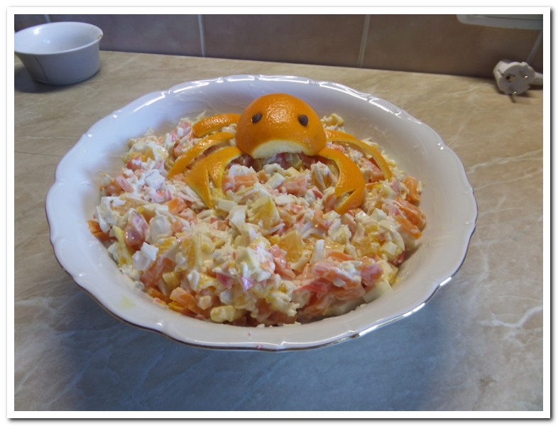 Для салата нужно: Жена - 1 шт., яйца, морковка, апельсин, крабы или крабовые палочки, майонез, соль, перец.