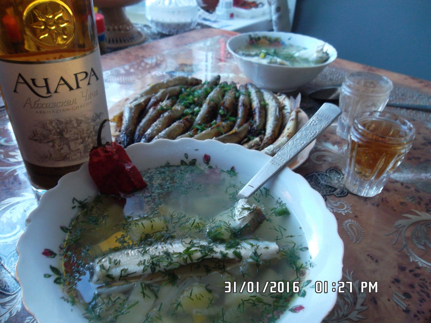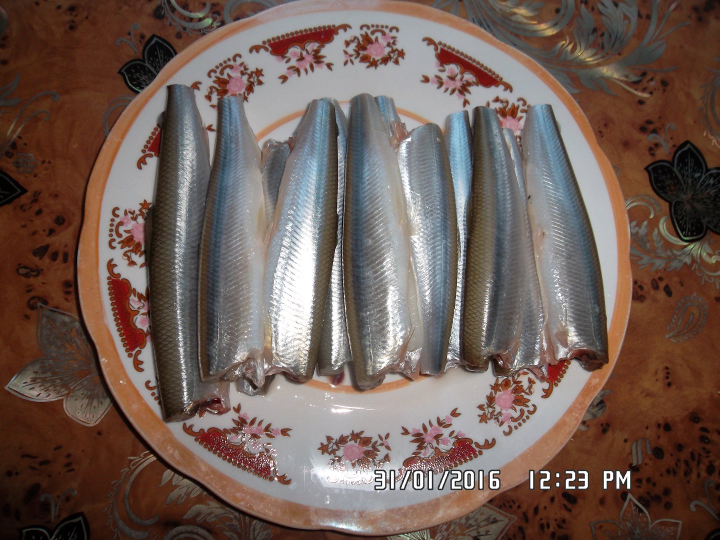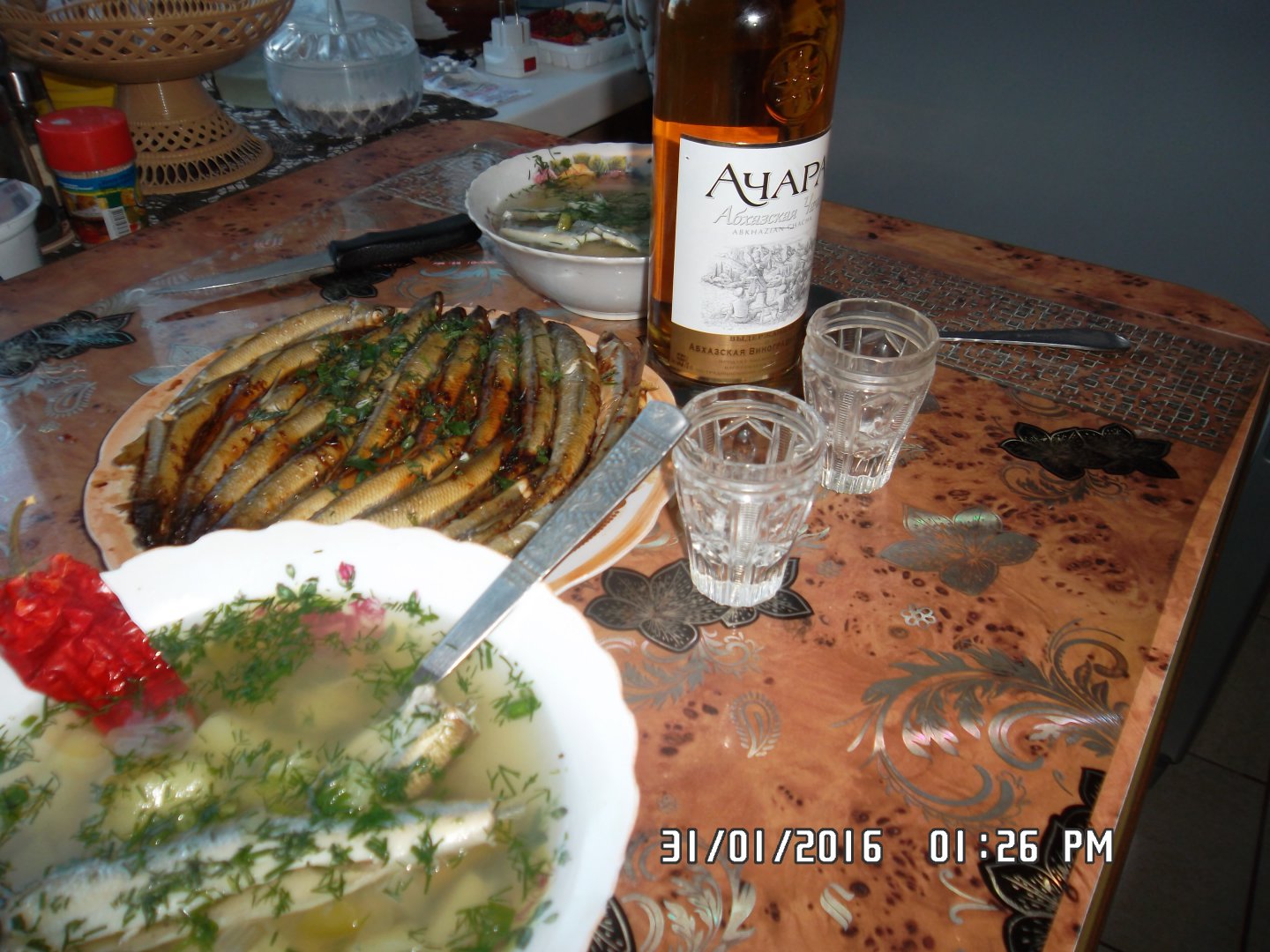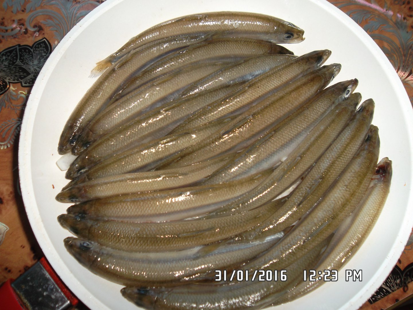 Рецепт подсказал человек долгое время проживший на Сахалине,как быстро и вкусно приготовить корюшку.Нарезаем лук кольцами и укладываем на дно сковороды в один слой,чтоб потом корюшка не касалась дна сковородки,выливаем туда 3 ложки кандяна,плотно укладываем корюшку как на фото и на огонь,как закипит убавляем огонь до минимума накрываем крышкой и через 12-15 минут блюдо готово.