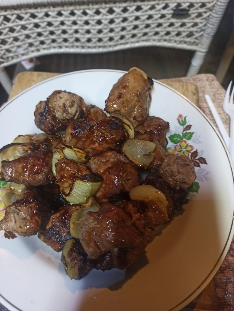 Пятница, видимо крайние теплые деньки/вечера, решили провести у мангала. Хоть и заколол свою свинью, пришлось купить ( не успевал разморозить) , свиная шея. Соль, чёрный перец, специи для шашлыка, Вустер, 300 мл пива, лук, на час-полтора маринуем. Нанизываем на шампур и в фольгу на 10-15 минут. Затем фольгу выкудываем, делаем корочку и на стол. 💥 п. С. Вкус вырви глаз!!!!!!!! Настолько сочно и мягко что, ппц! Рекомендую. Приятного аппетита.