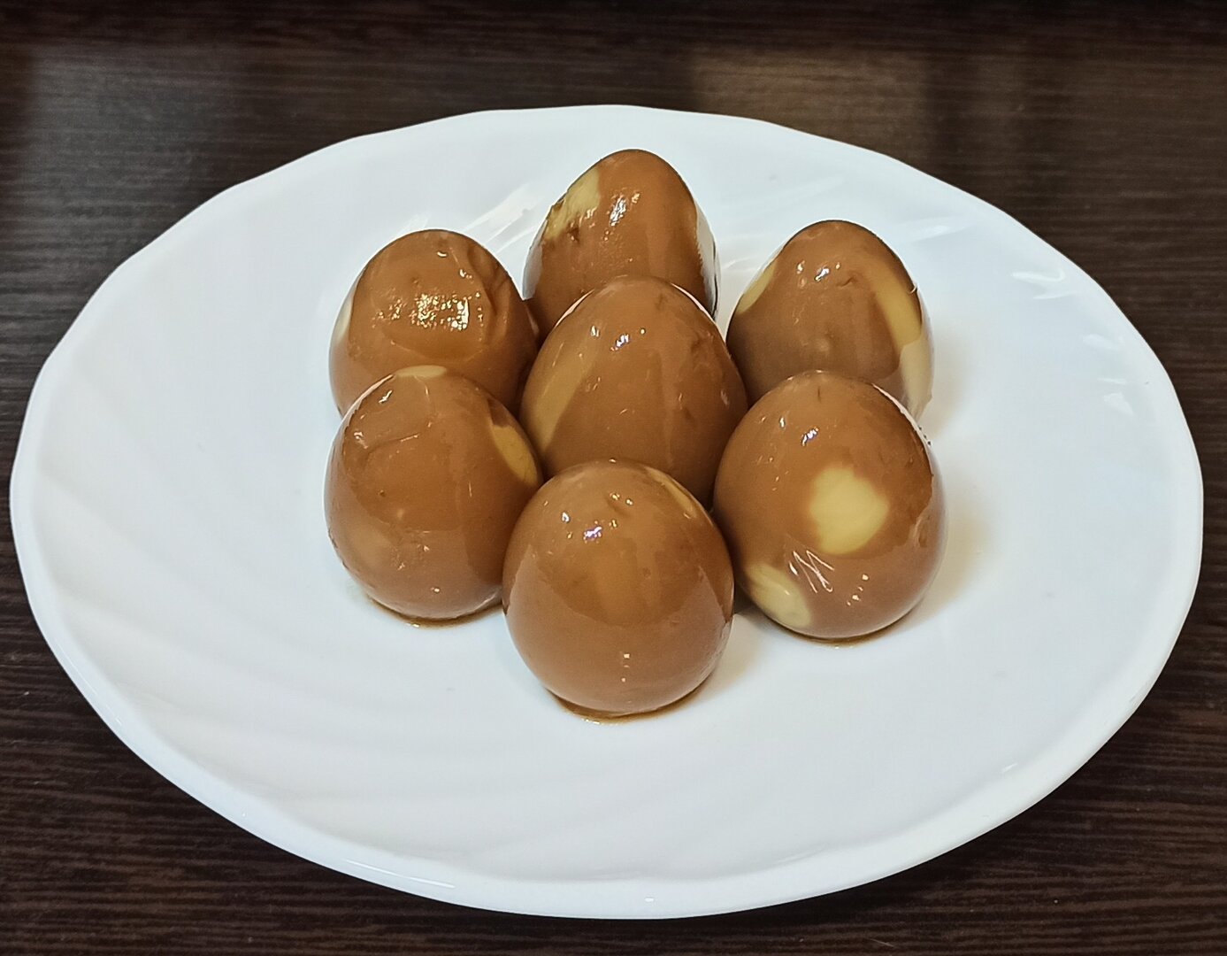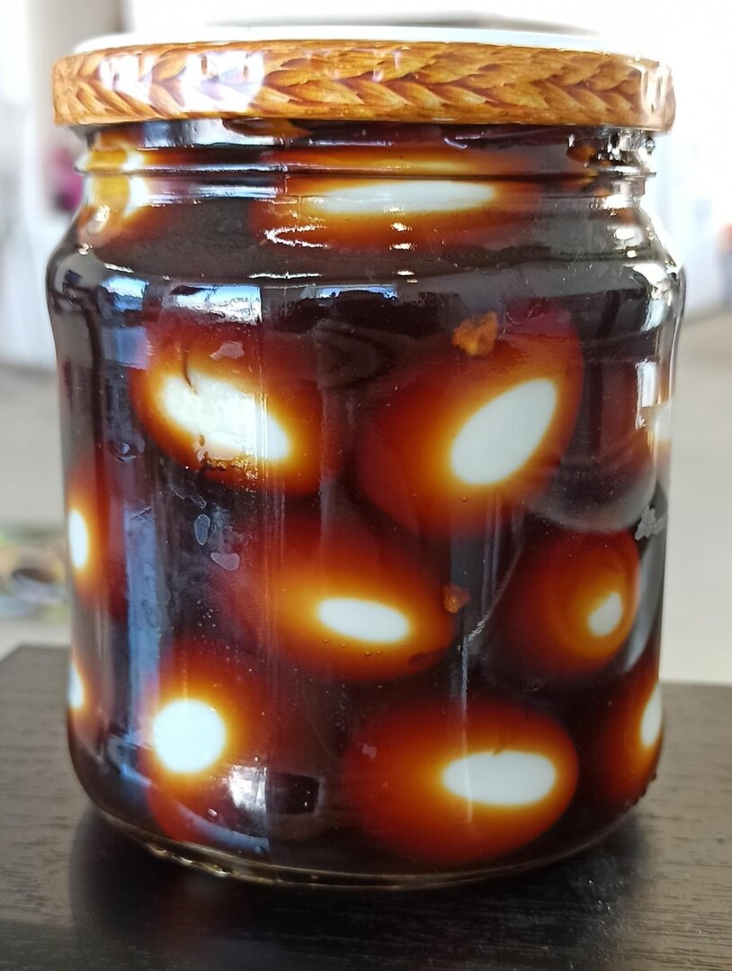 Смешал соевый соус, заварку чайную, имбирь, перчик горошком, острый перчик, чеснок. Закипятил, всё это дело, остудил и залил перепелиные яйца (варёные и очищенные)