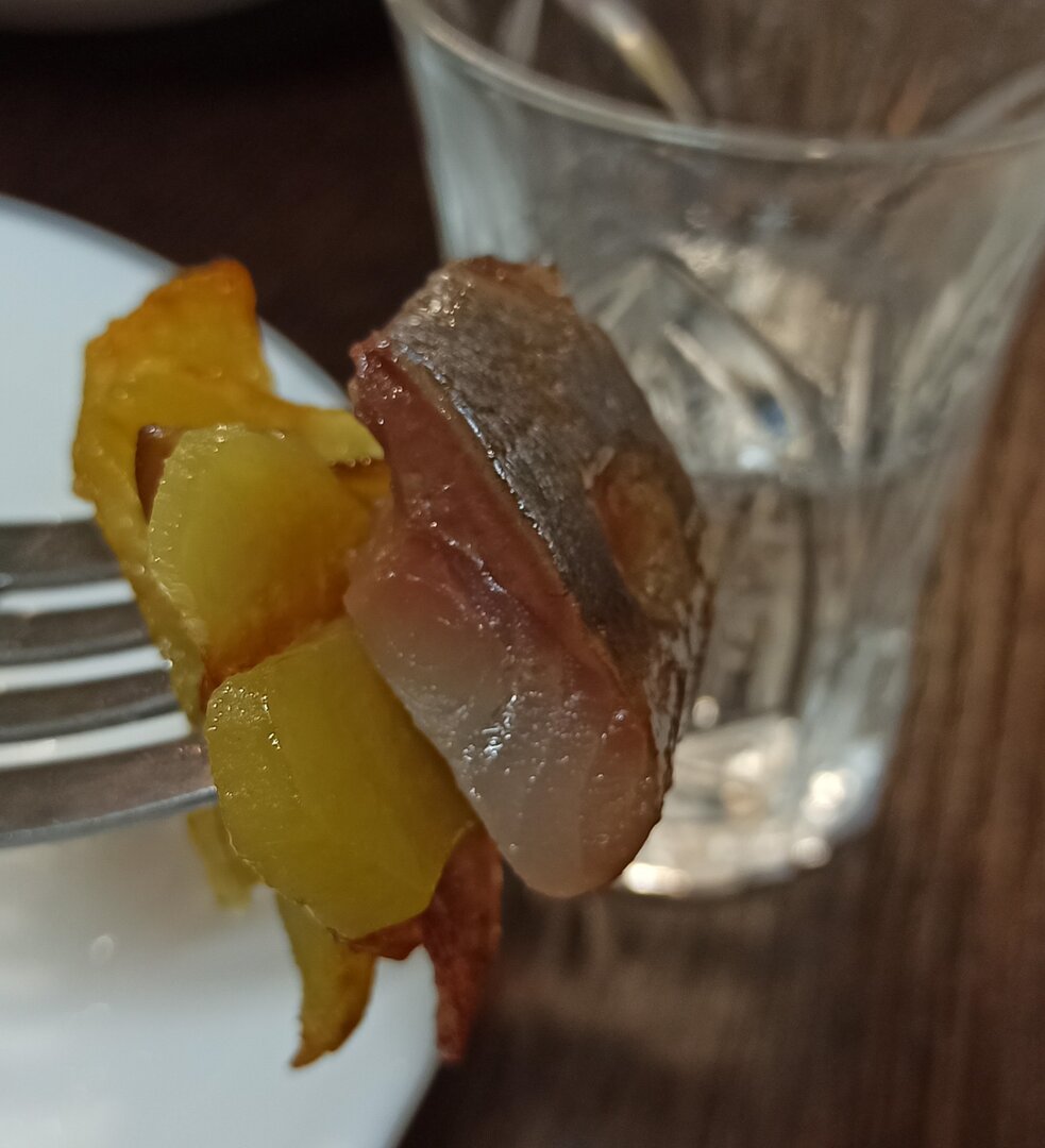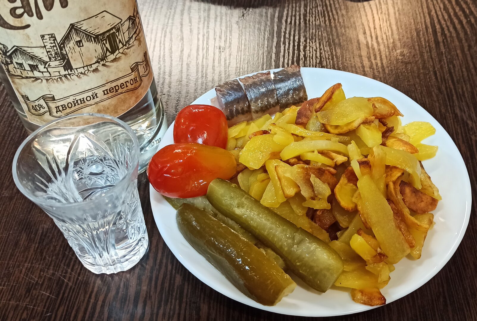 Картошечка пожарена, селедочка холодного копчения почищена, соленья домашние на тарелочке, в рюмочке налито....