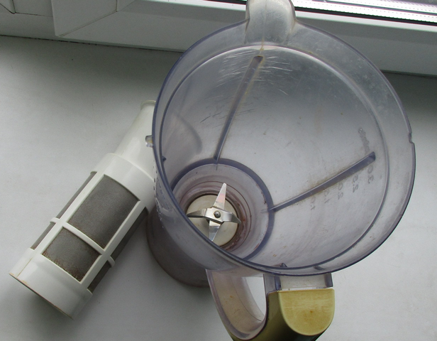 Отходы собираются внутри этой сетки, а сок пролазиет через нее в стакан. Производительность получается небольшая, и после каждого пол-литра сока приходится разбирать и прочищать сетку. Но работает.